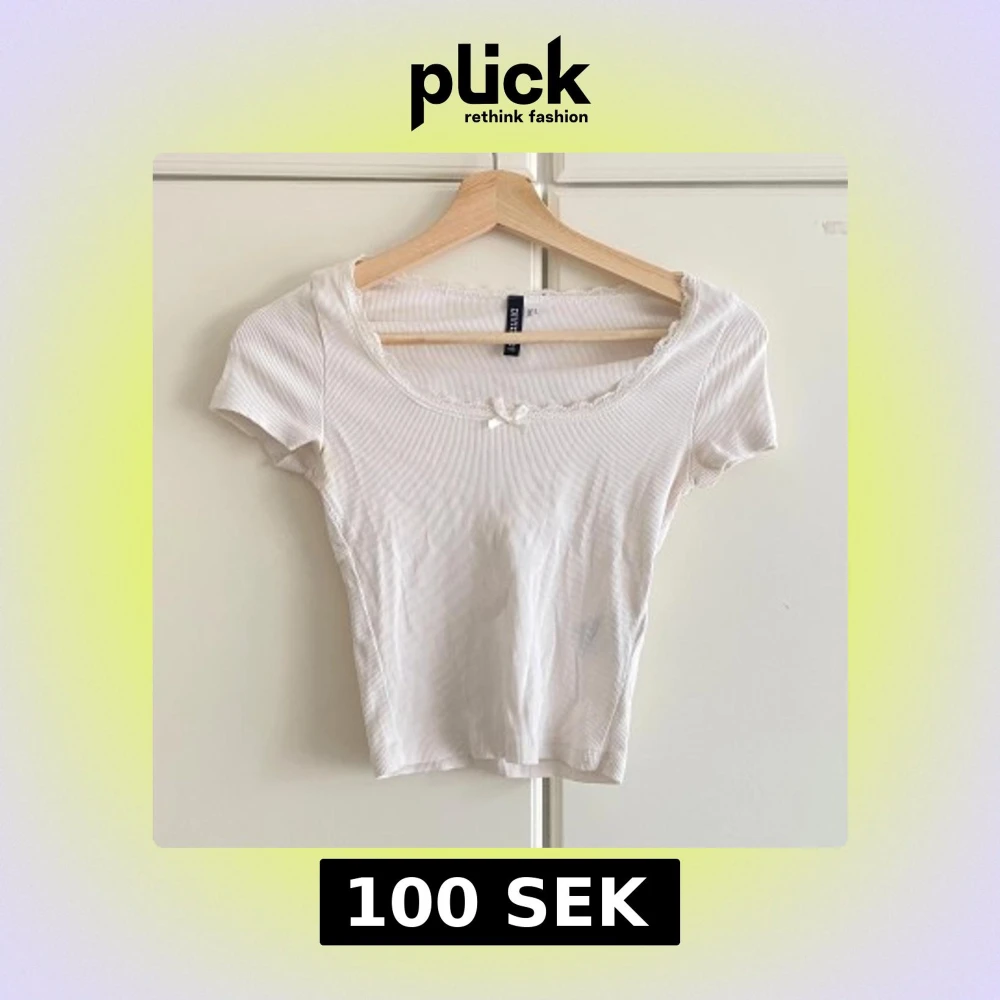 Supersöt vit ribbad topp från Divided med korta ärmar, spetskant vid halsringningen och en liten rosett framtill. Toppen har en figurnära passform och är perfekt för dig som gillar en romantisk och feminin stil.