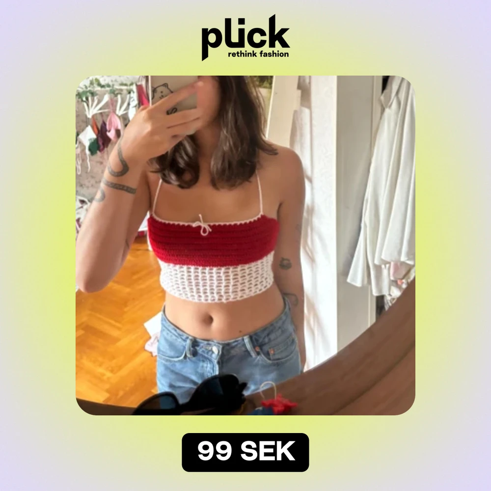 Säljer en oanvänd virkad top i röd och vit. Gjord av akrylgarn. Rekommenderar att handtvätta❤️