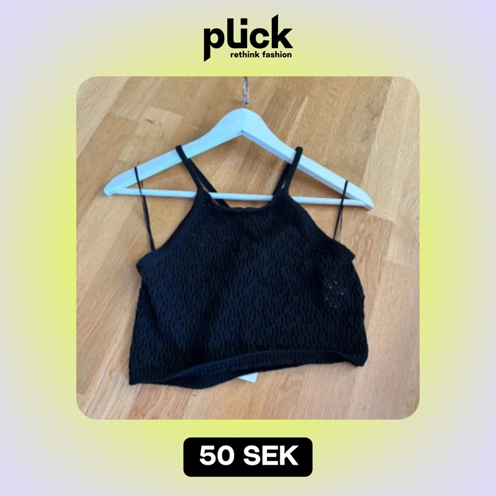 Virkad, svart topp med band korsade i ryggen. Har aldrig använts och lappen är kvar.
