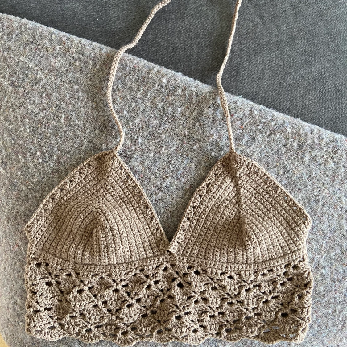 Supergullig brun topp som jag har virkat själv❣️ Knyts i nacken och vid ryggen vilket innebär att passformen kan justeras. Skulle eventuellt också kunna virka liknande på beställning om önskas
