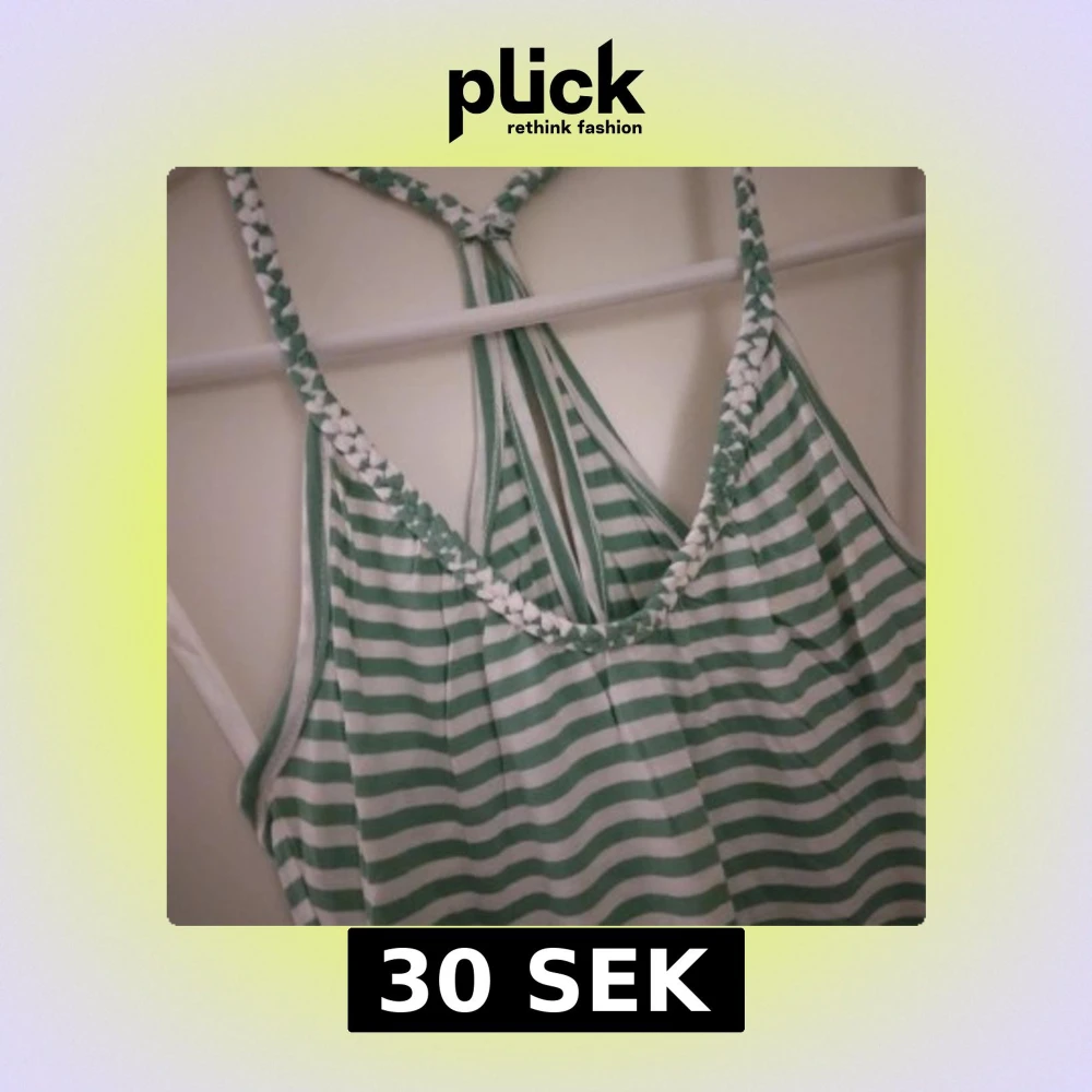 Randigt grön / vit linne / topp med flätade band. Strlk: XS. Viskos. Helt NY & OANVÄND. Felfri. Tags sitter kvar sedan inköpet. Säljer även likadan fast svartvitt. Nypris var 98 kr.