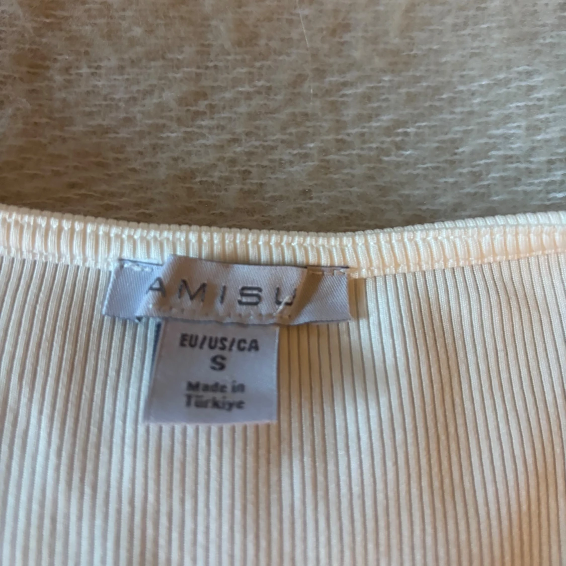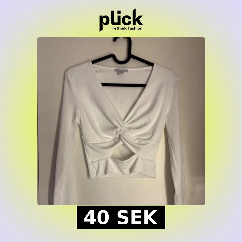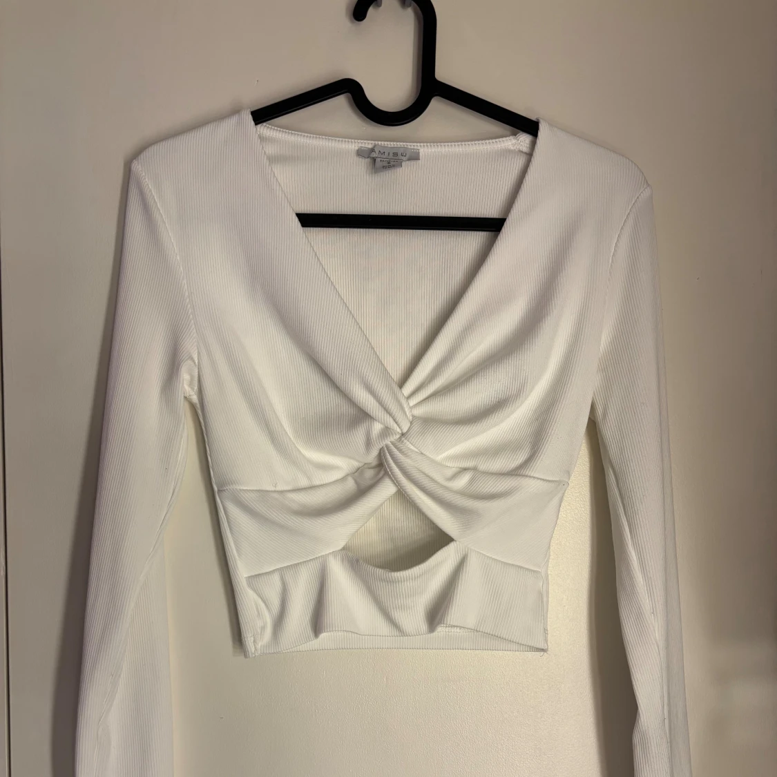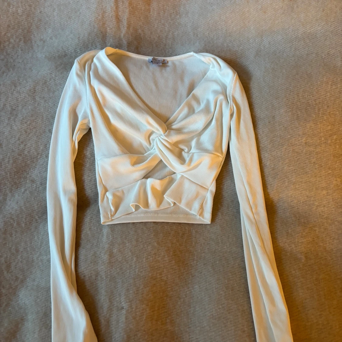 Säljer en vit ribbad topp från Amisu i omlottmodell med twistad detalj framtill i storlek S.