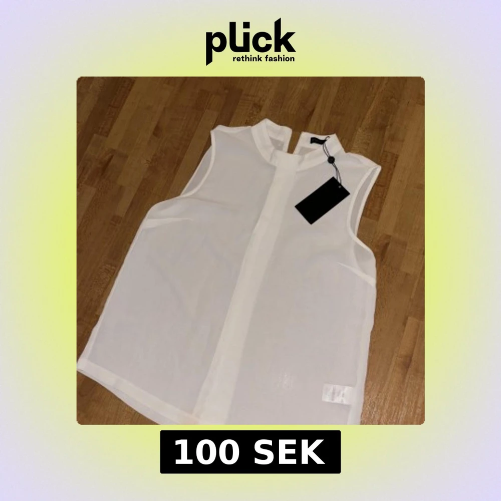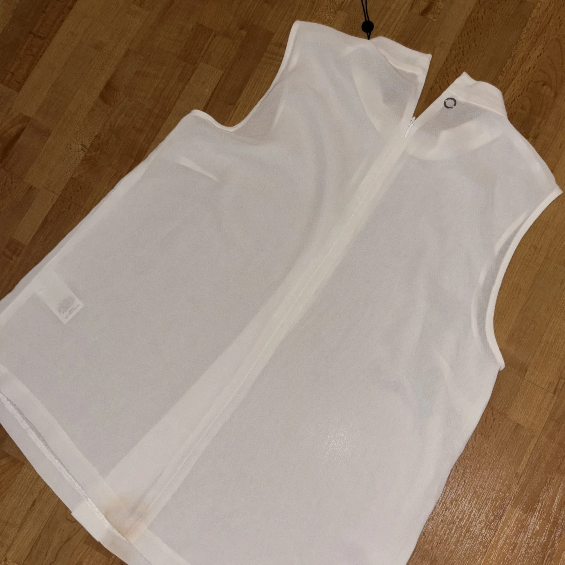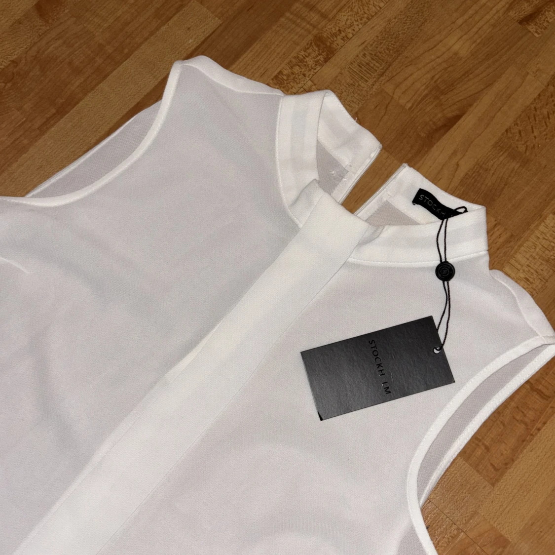 Säljer en stilren vit ärmlös blus från Stockh LM. Blusen har hög krage och är tillverkad i ett tunt, lätt material som ger en luftig känsla. Perfekt att matcha med både jeans och kjol.Den har en liten fläck trots att den är oanvänd men går inte att märka om man ej kollar noggrant.