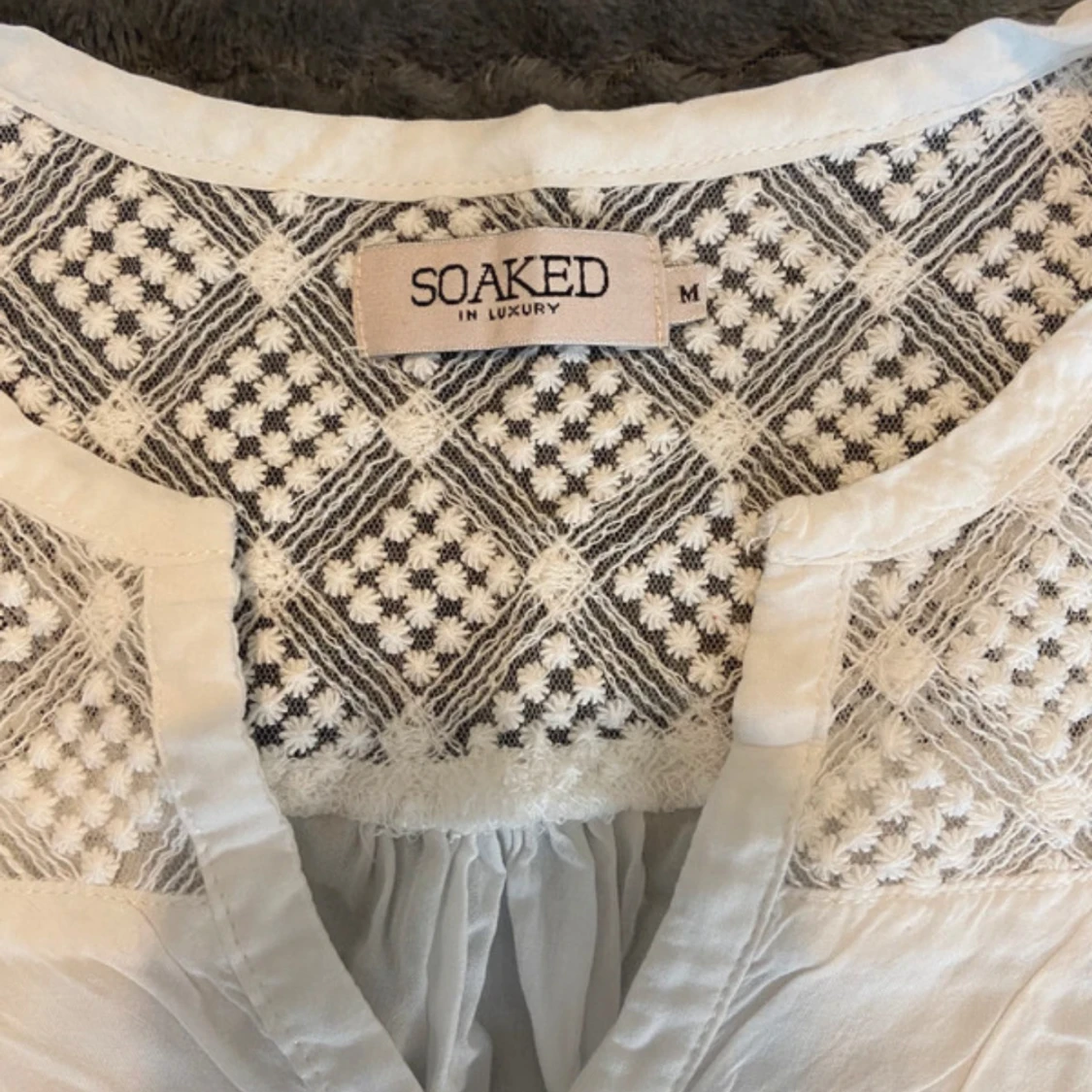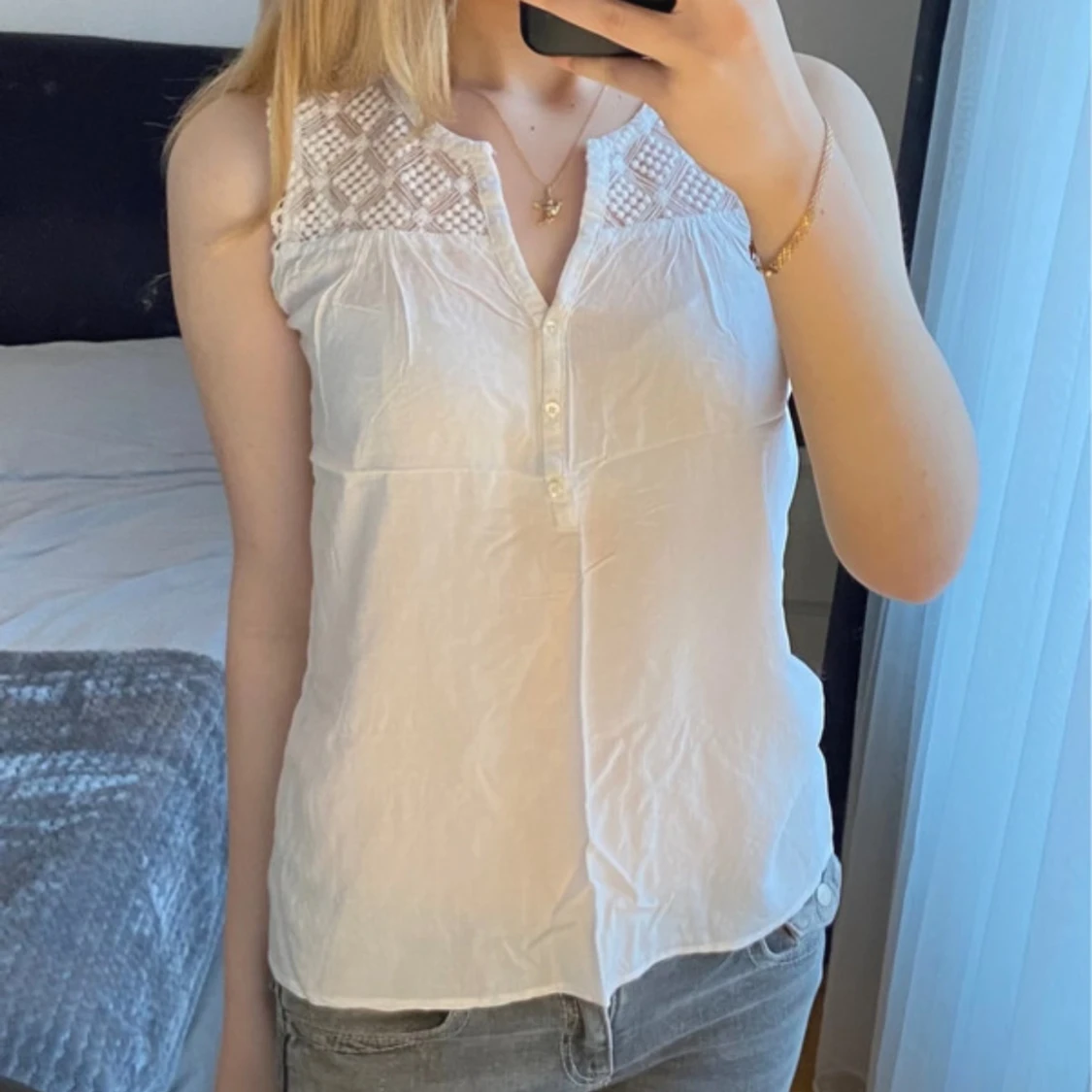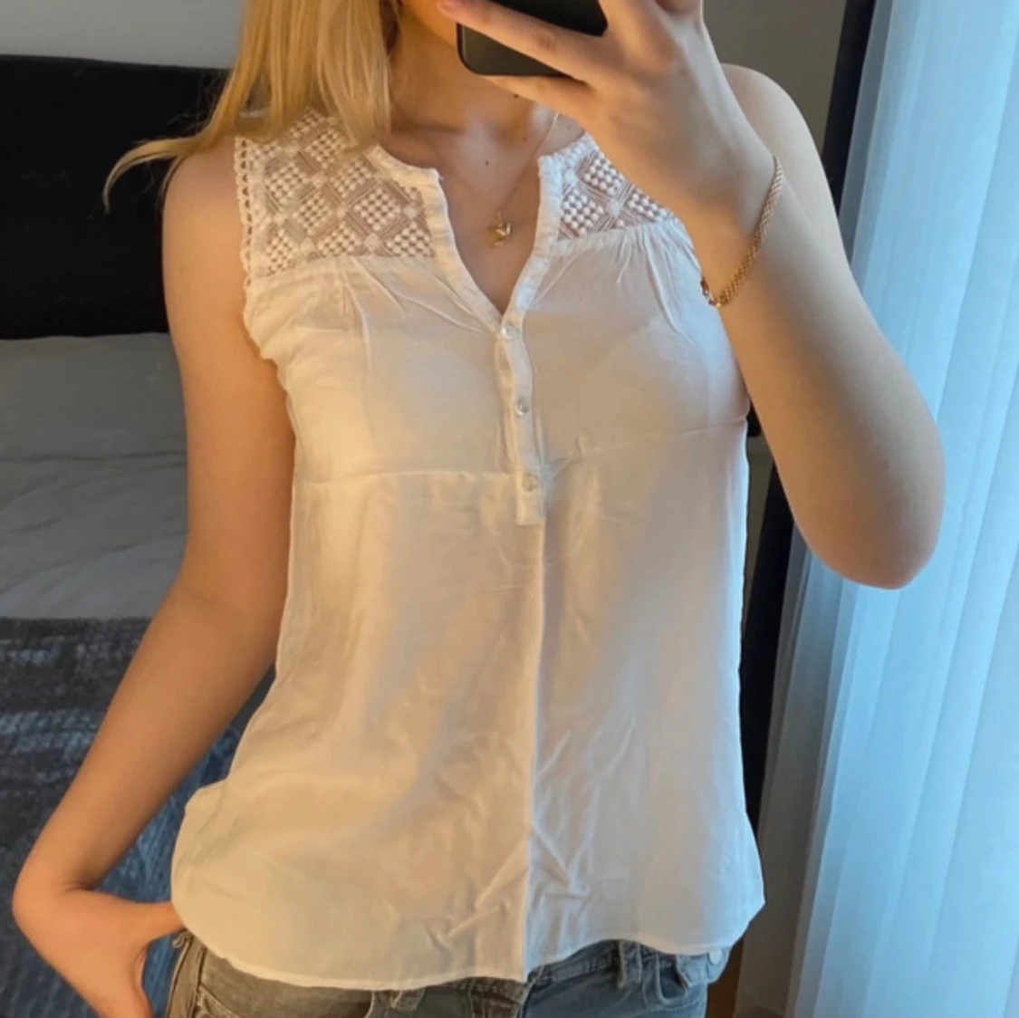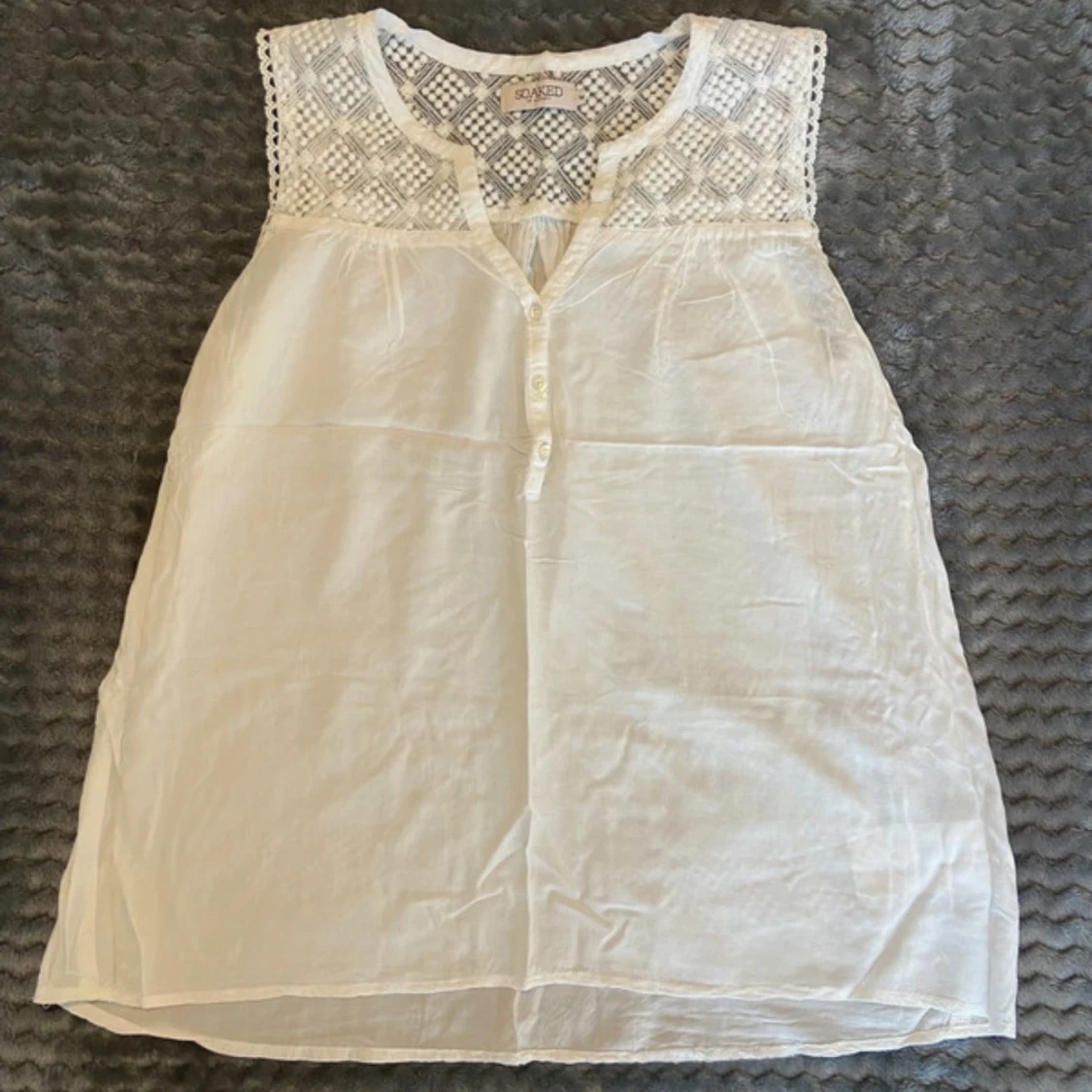 Supersöt vit blus från Soaked med ärmlös design och spetsdetaljer upptill. Blusen har knappar framtill och ett luftigt, lätt material som passar perfekt till jeans eller kjol. Spetsen har rutigt mönster och ger en romantisk vibe. Perfekt för varma dagar!