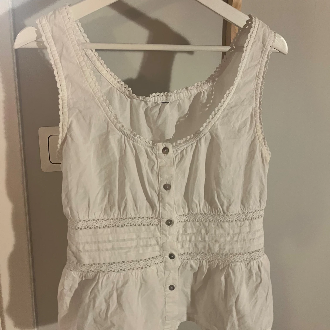 Supersöt vit blus i bomull med knappar framtill, spetsdetaljer och volang nedtill. Den är från hm i storlek xs, men lappen är bortklippt!