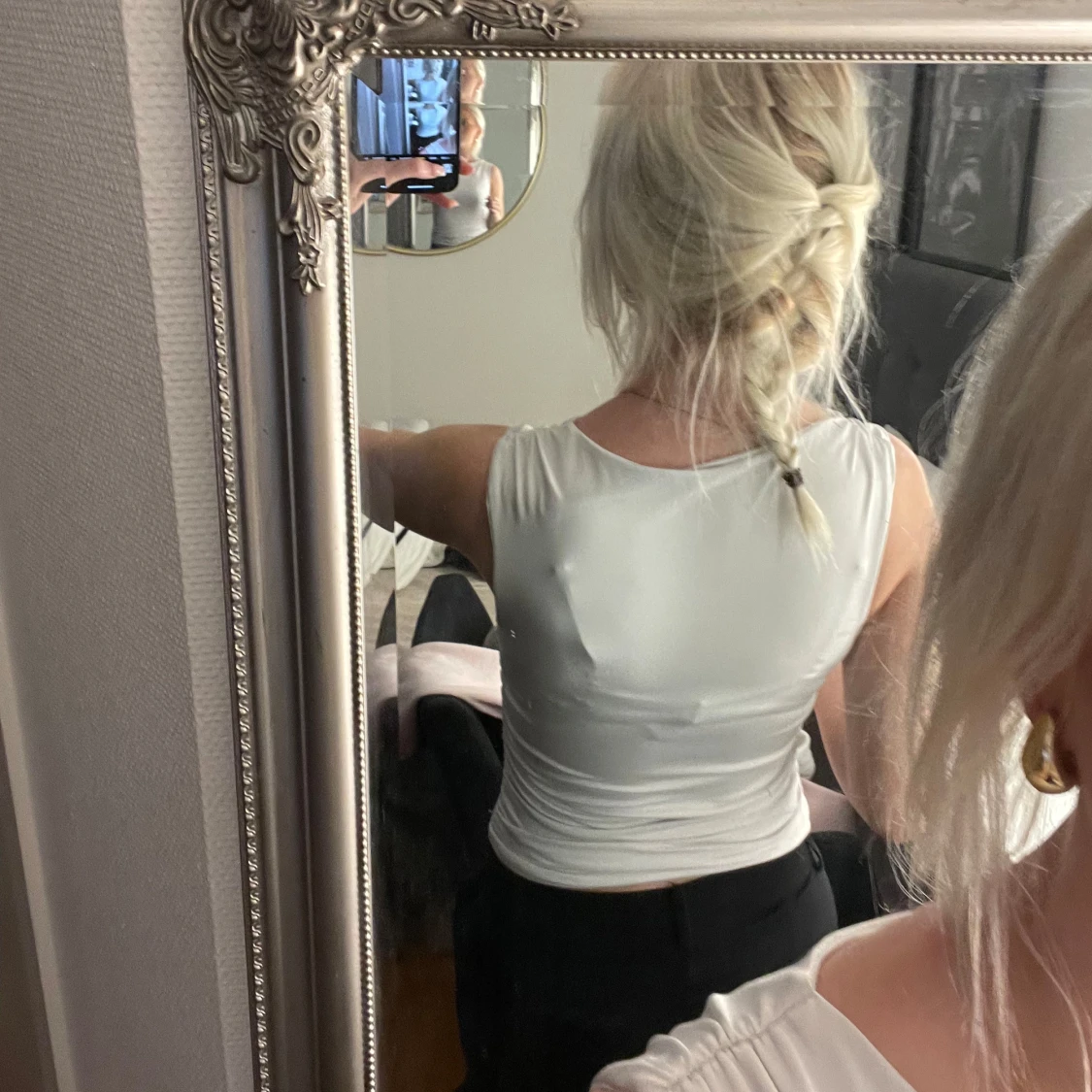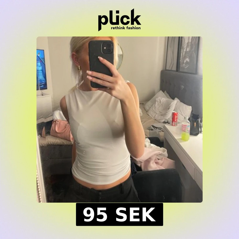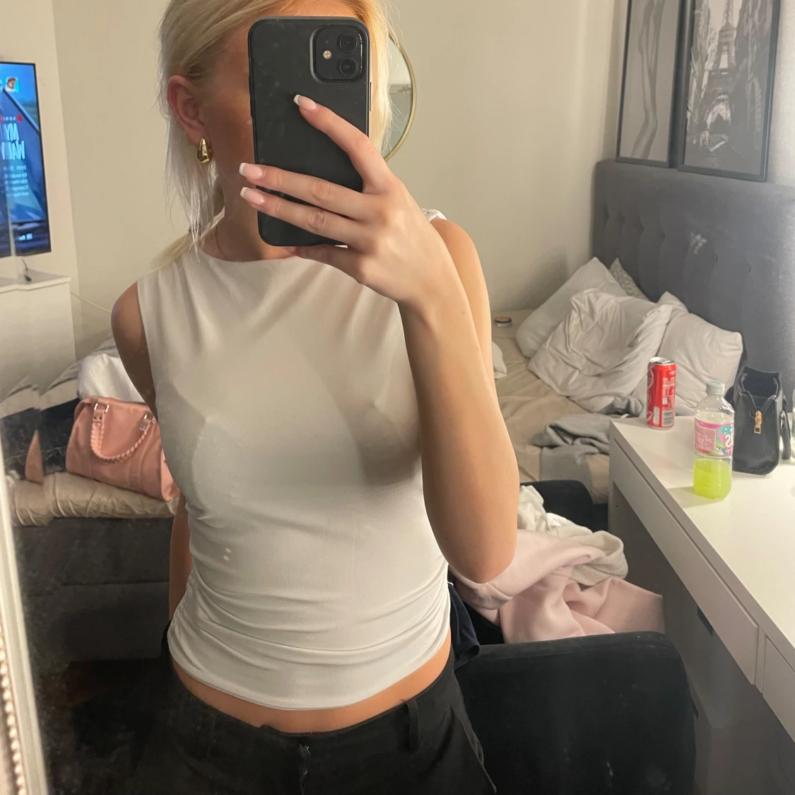 Säljer en stilren vit ärmlös linnetopp med hög halsringning. Toppen sitter tight mot kroppen, perfekt att matcha med jeans eller kjol. Materialet känns mjukt och stretchigt, vilket gör den superbekväm. Använd fåtal ggr, nypris 200kr