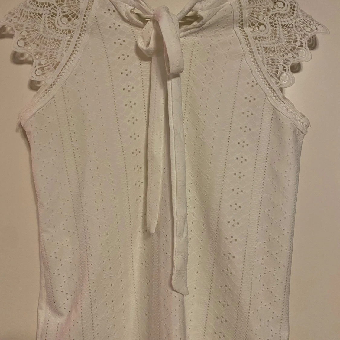 Säljer en söt vit ärmlös topp med vackra spetsdetaljer vid axlarna. Toppen har en knytning i nacken. Strl S och fint skick!