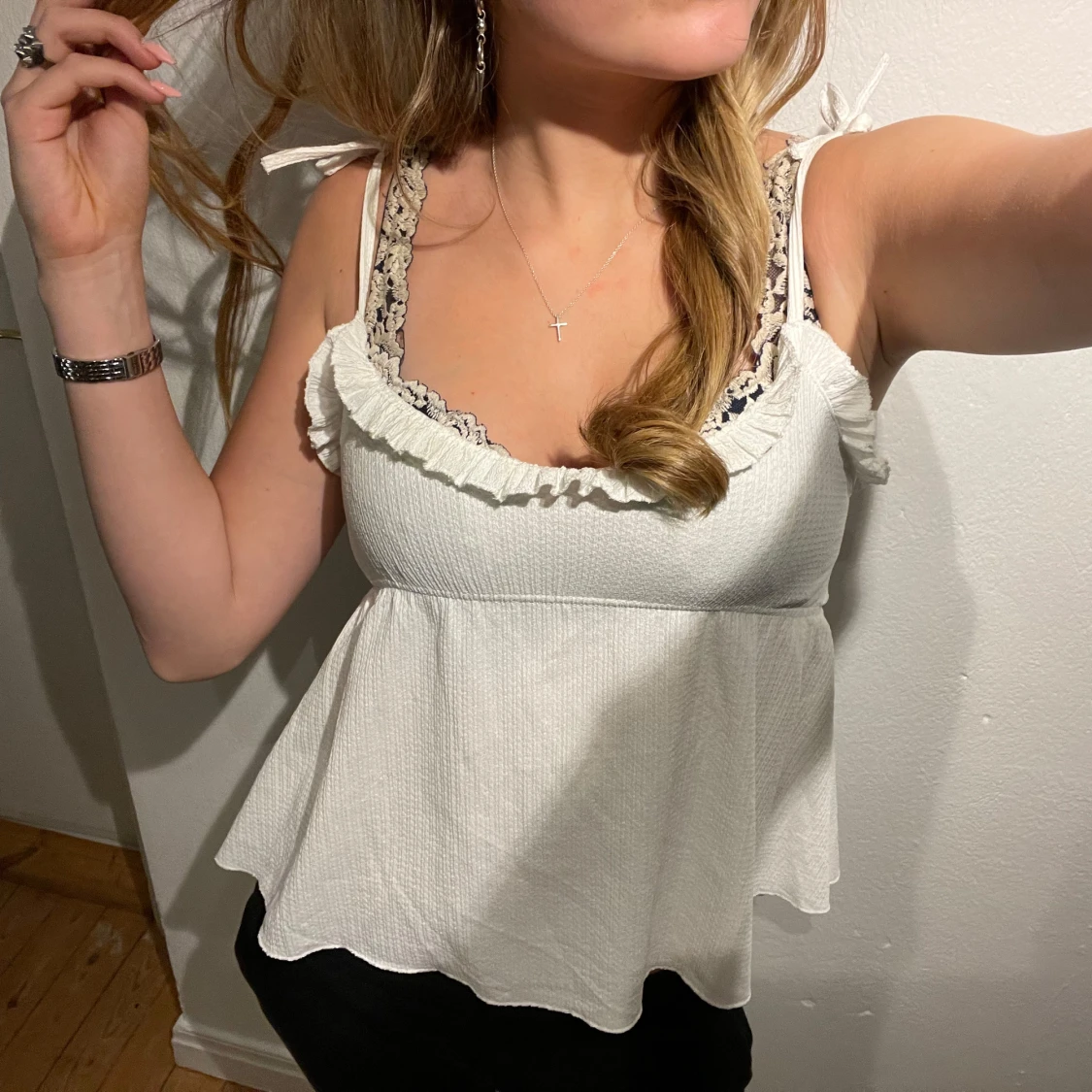 Säljer en söt vit ärmlös topp volangkant. Toppen har smala axelband och en luftig passform, perfekt för sommardagar. Den är i mycket bra skick och passar både till vardags och fest.