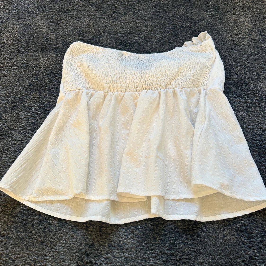 Söt vit tubtopp med volangkant upptill och knyt framtill. Toppen är axelbandslös och har en lätt struktur i tyget samt smock baktill för extra komfort. Perfekt för en somrig look och passar till både jeans och kjol.