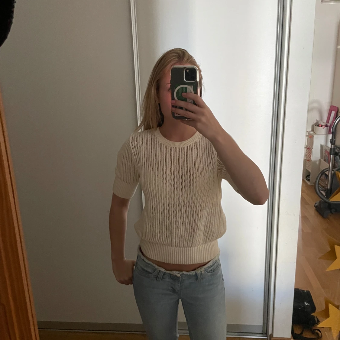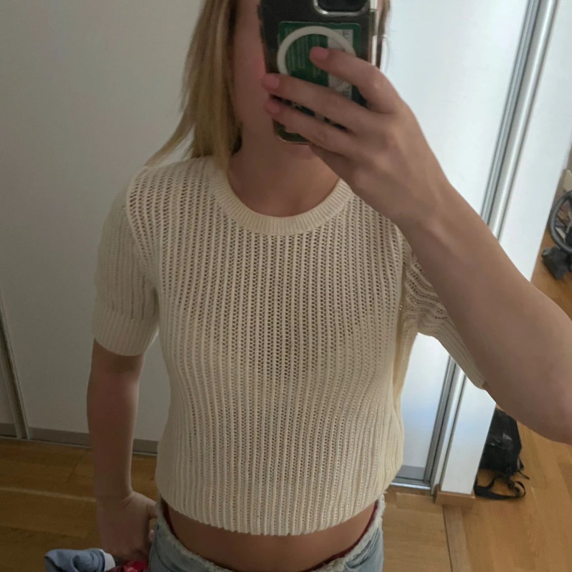 Säljer en beige stickad tröja med korta ärmar och rund hals. Tröjan har ett luftigt, hålstickat mönster och breda muddar vid ärmslut och midja. Storlek M men passar mig som använder xs/s!