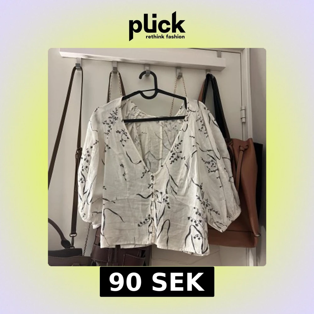 Supersöt vit blus från H&M i linneblandning med svarta broderade blommor, v-ringning och knappar framtill. Blusen har puffiga långärmar och en luftig, lite croppad passform. 💕