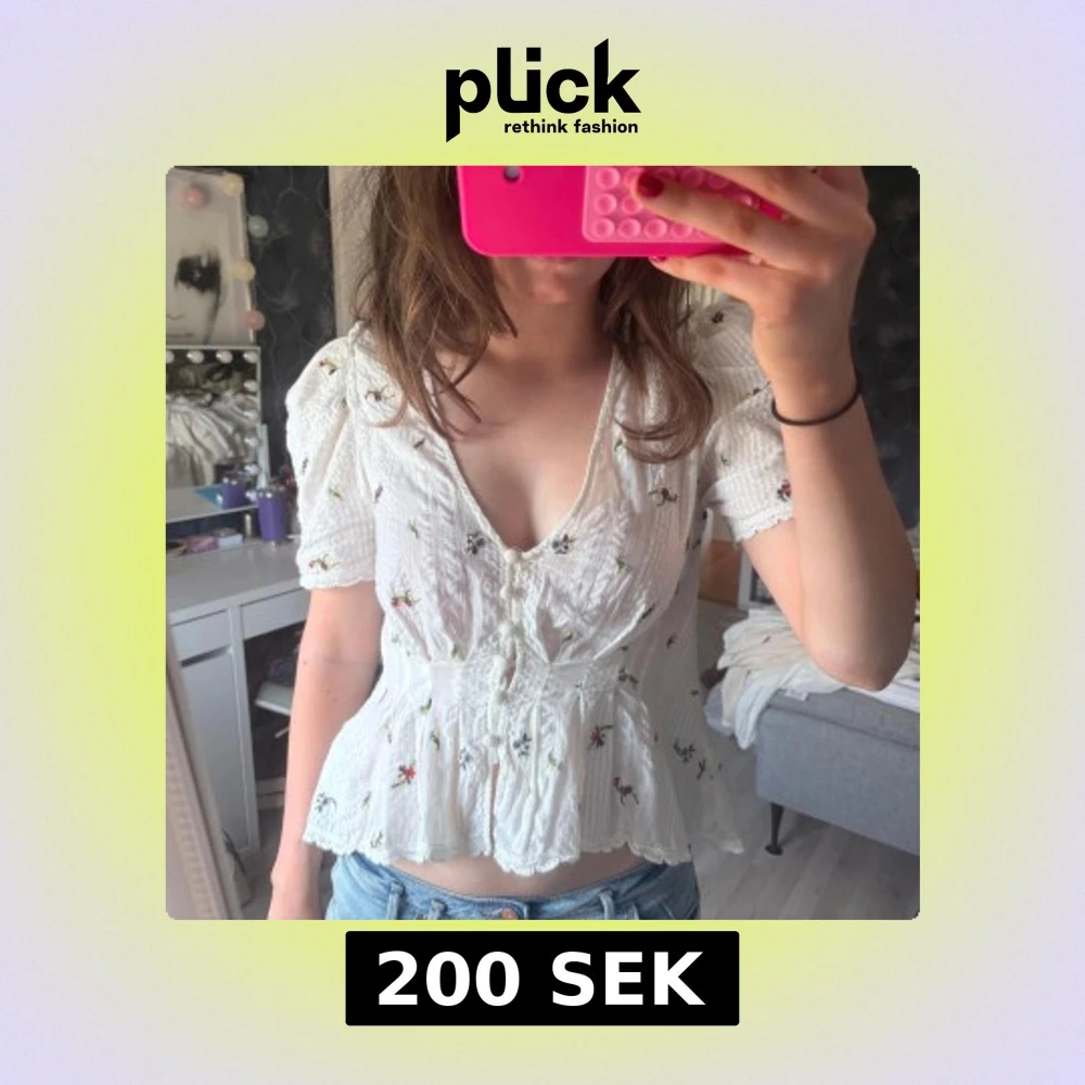 Supersöt vit blus med broderade små blommor i olika färger. Blusen har v-ringning, puffiga korta ärmar och markerad midja. Framtill sitter klädda knappar och tyget är lätt och luftigt med fina detaljer. Perfekt för en romantisk look i sommar eller vår.