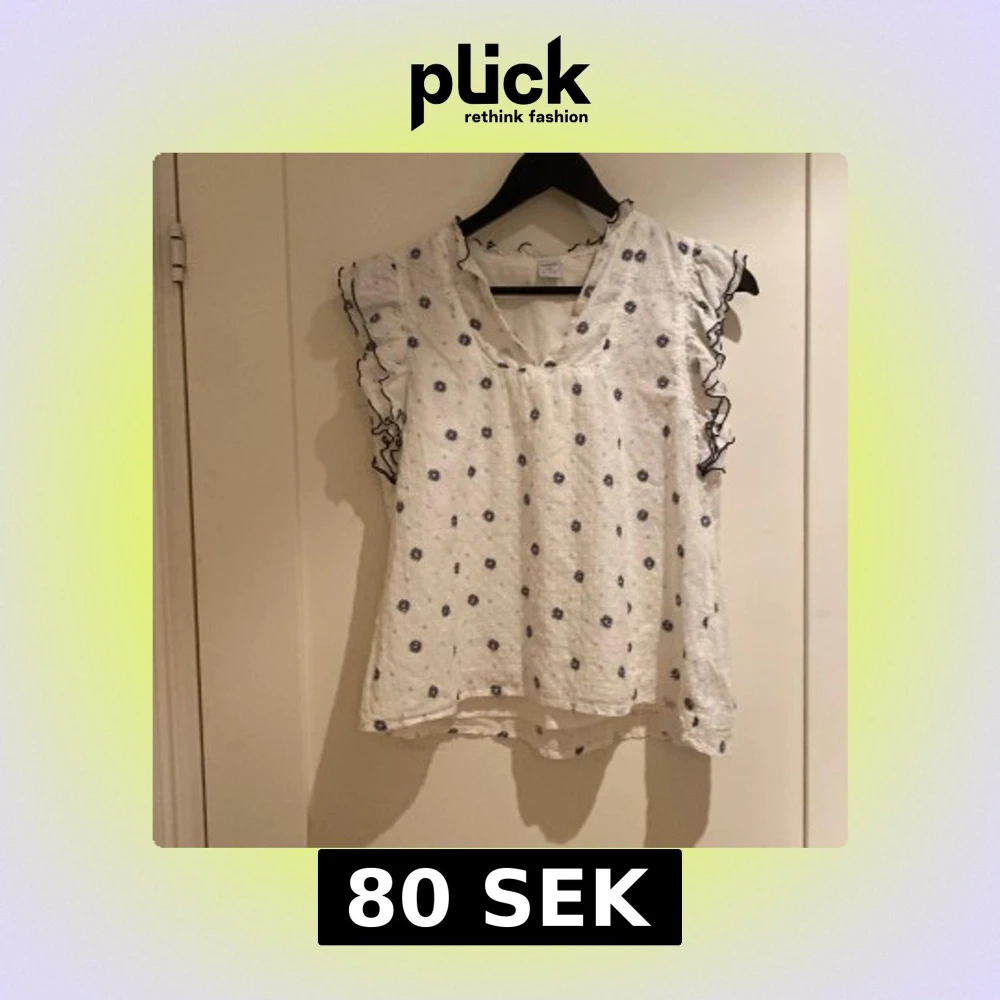 Supersöt vit blus från Lindex med små blå blommor och volangdetaljer på ärmarna. Blusen har v-ringning och är ärmlös med svarta vågiga kanter på volangerna. Perfekt för en fräsch och somrig look!