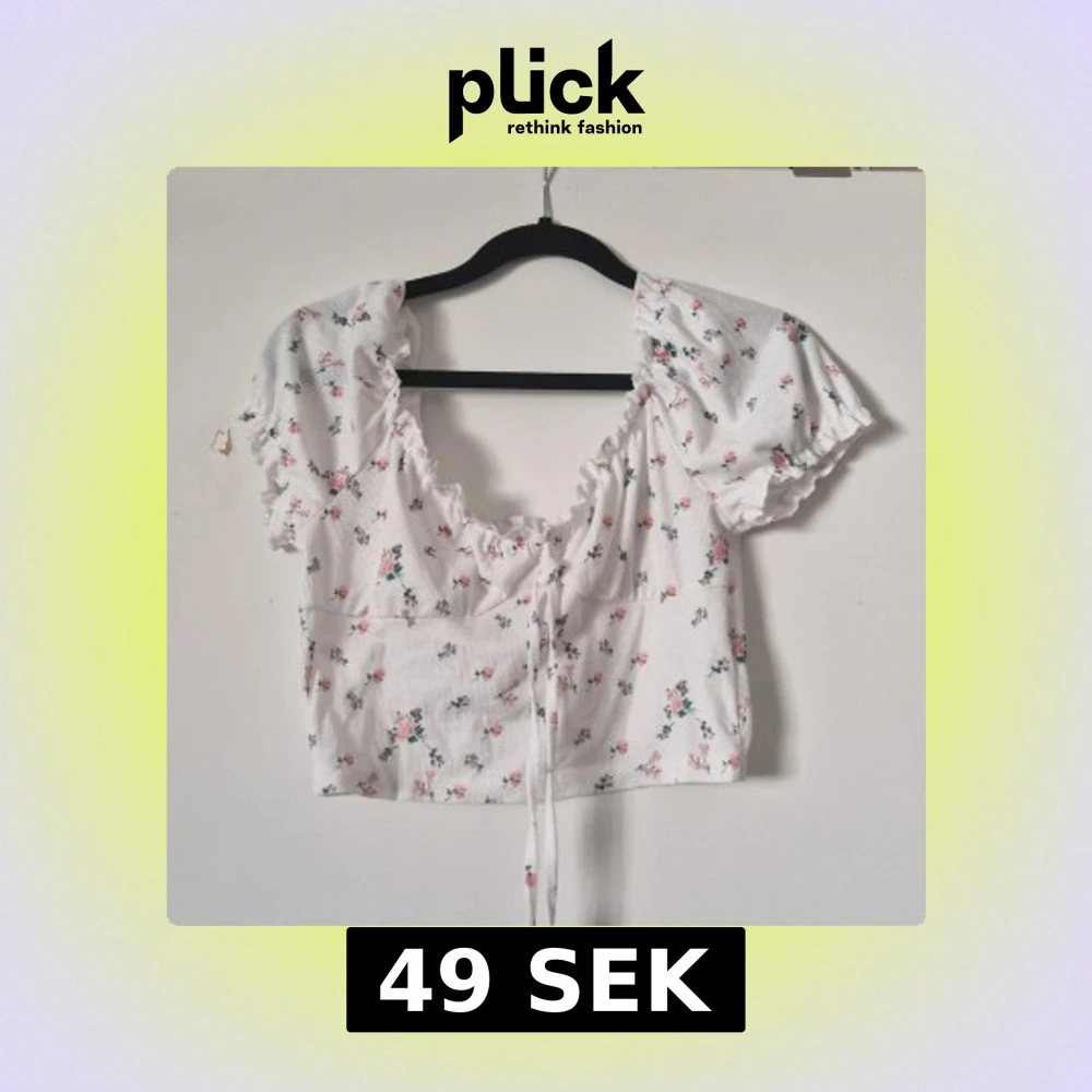 Charmig vit croppad topp med blommigt mönster i rosa och grönt. Toppen har korta ärmar med volangdetaljer och en söt knytning framtill. Perfekt för en somrig look!