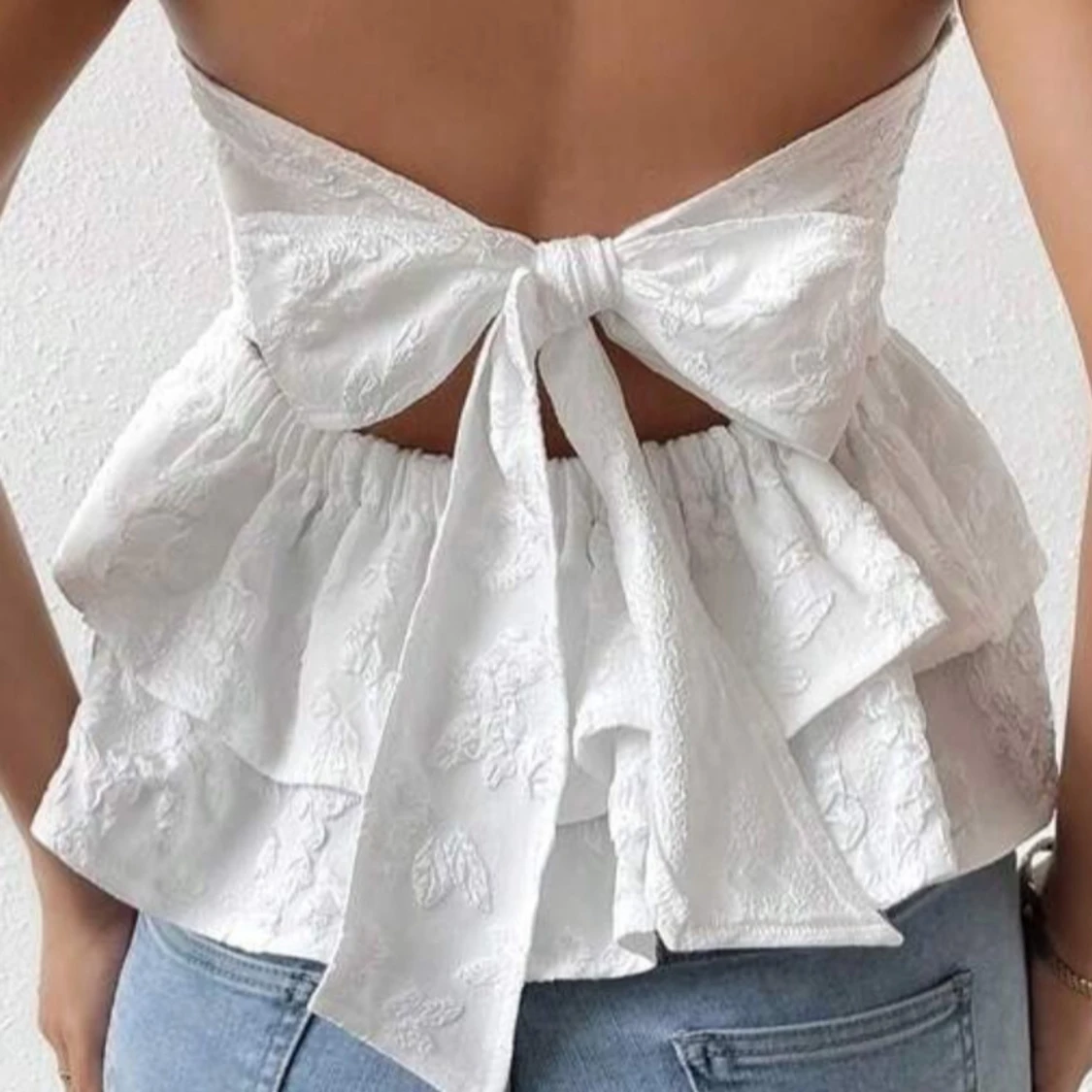 Superfin vit tubtopp med blommigt broderat mönster och volangdetaljer. Toppen har en stor rosett i ryggen och är axelbandslös med bandeauform. Perfekt för dig som vill ha en söt och trendig look till sommaren.