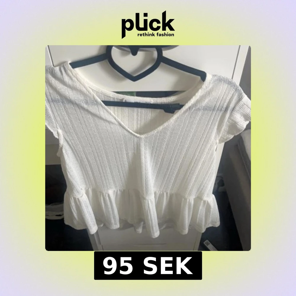 Säljer en söt vit ribbad blus med korta ärmar och volangdetalj i nederkant. Blusen har en v-ringad hals och är perfekt för en somrig look.