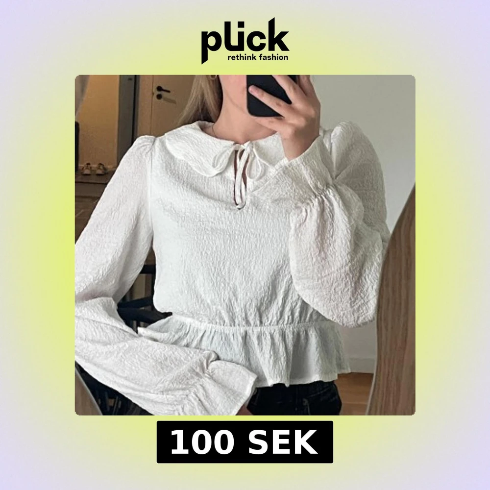 Supersöt vit blus med volangkant nertill, puffiga långärmar och stor krage med knytrosett framtill. Blusen har en lätt skrynklig struktur och ger en romantisk vibe. Perfekt att styla med jeans eller kjol för en trendig look.