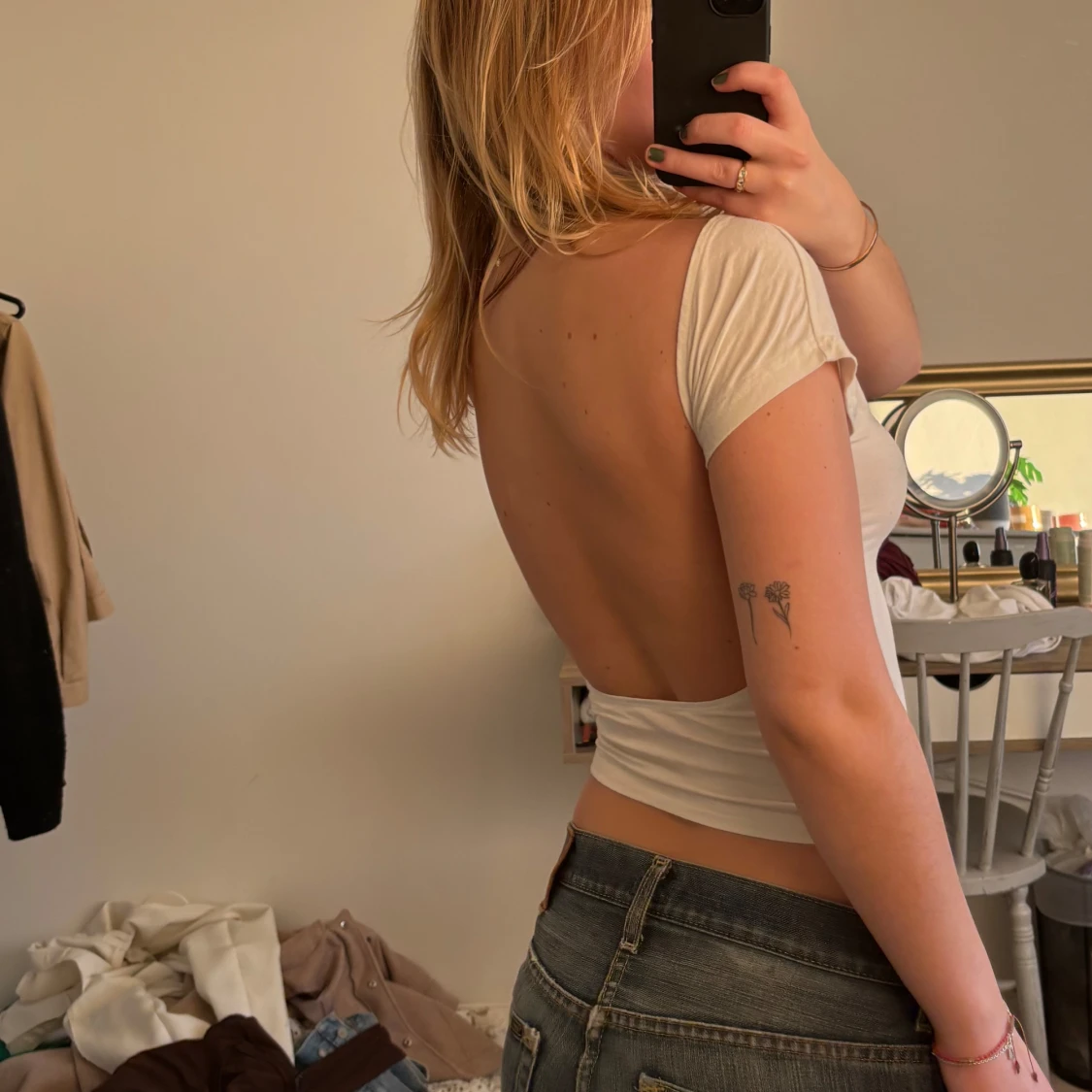 Säljer en stilren vit topp med korta ärmar och en öppen rygg. Jätteskönt material, tunn