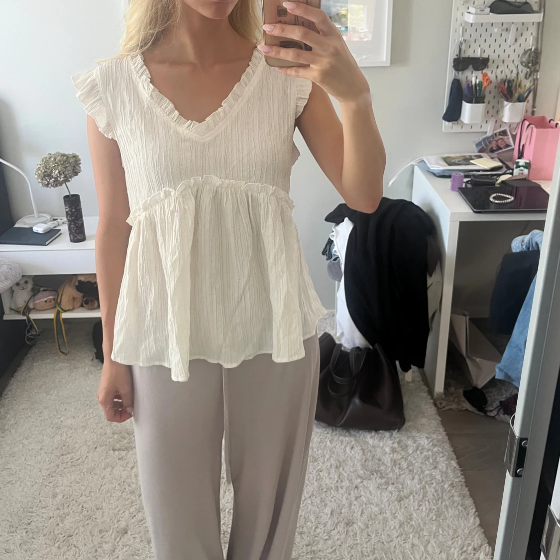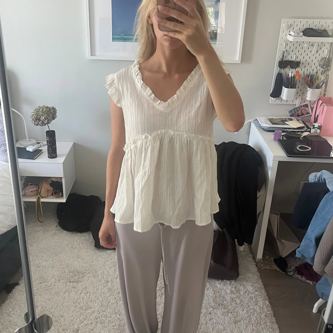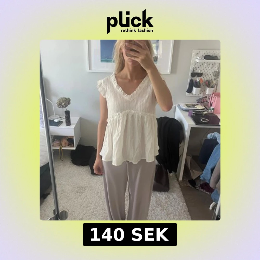 Säljer en söt vit blus med v-ringning och volangdetaljer vid ärmslut och midja. Blusen är ärmlös med lätt rynkad struktur och har en luftig, flowy passform. Perfekt för dig som gillar romantisk och avslappnad stil.