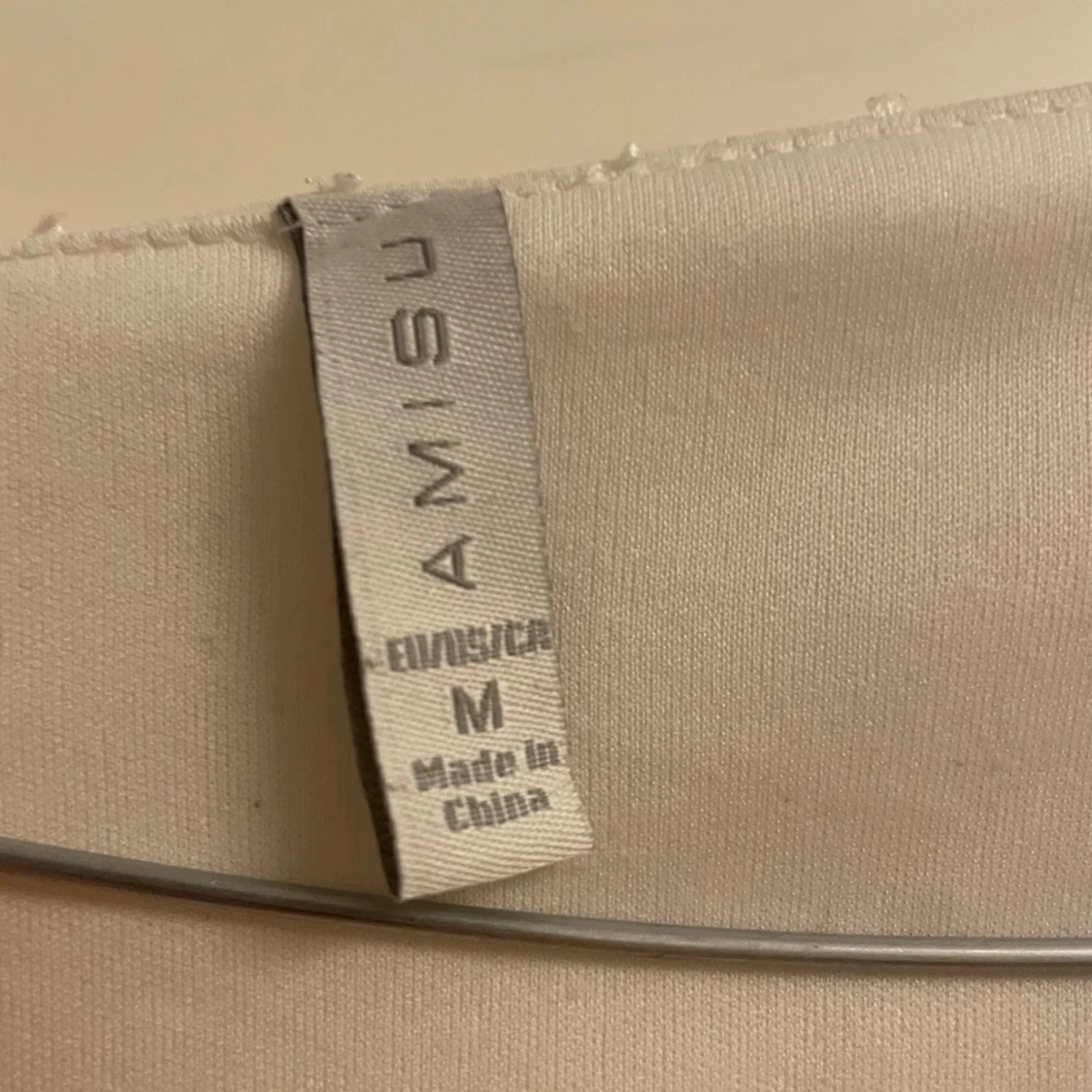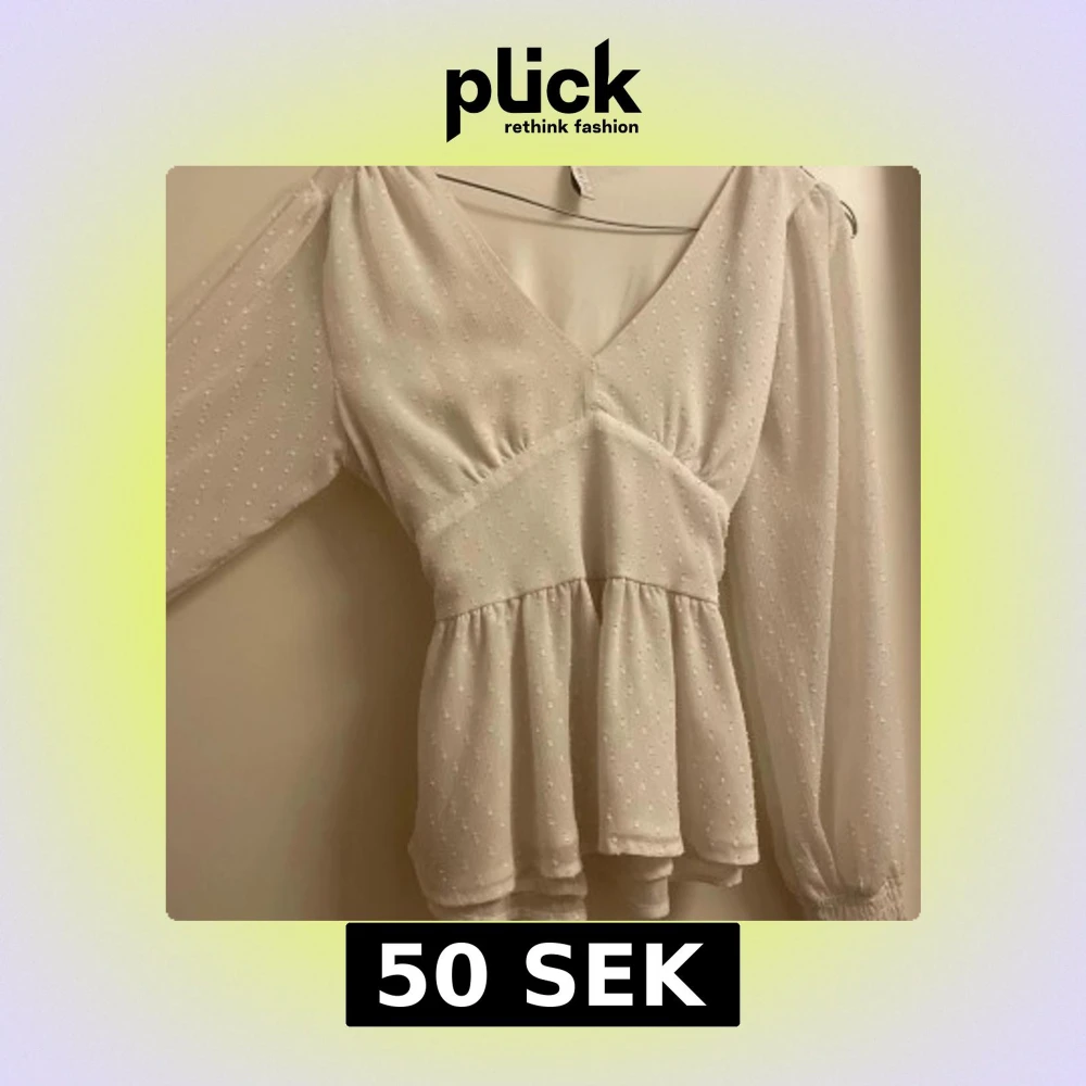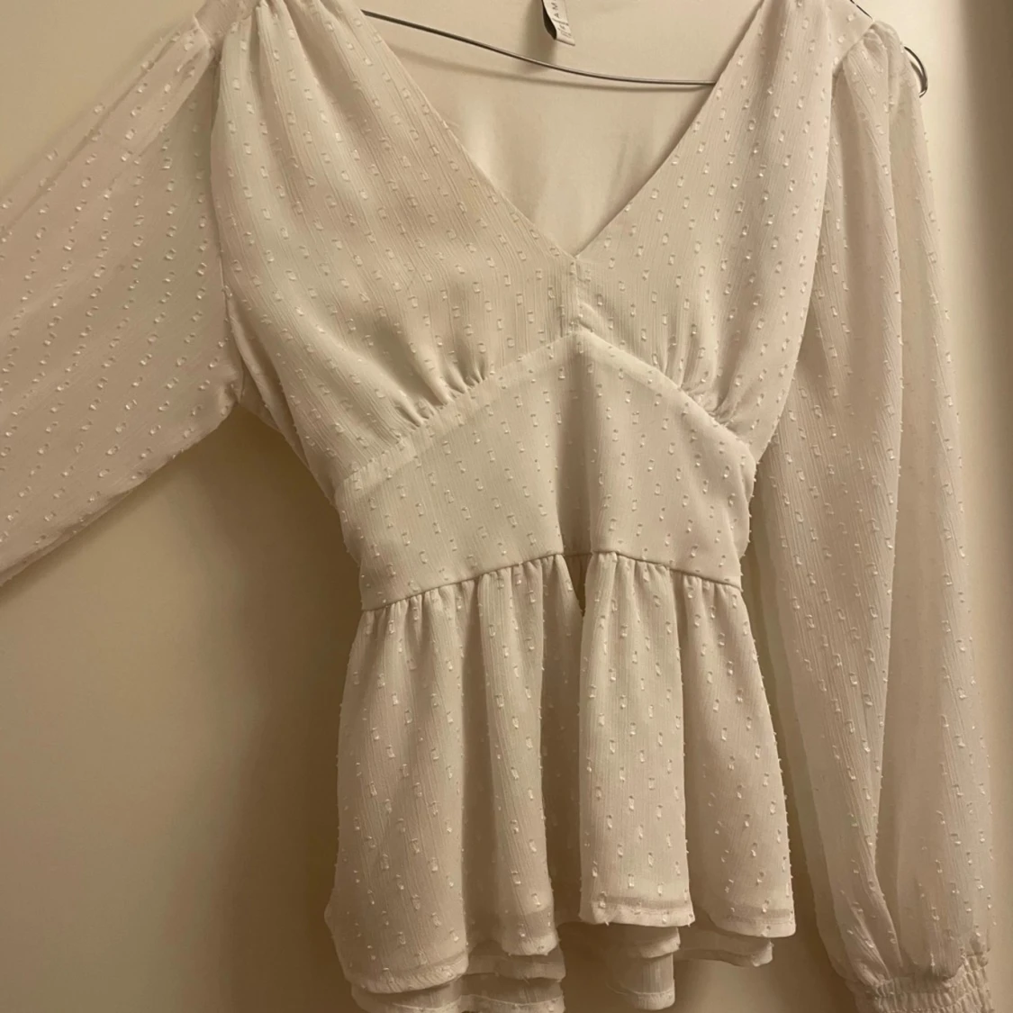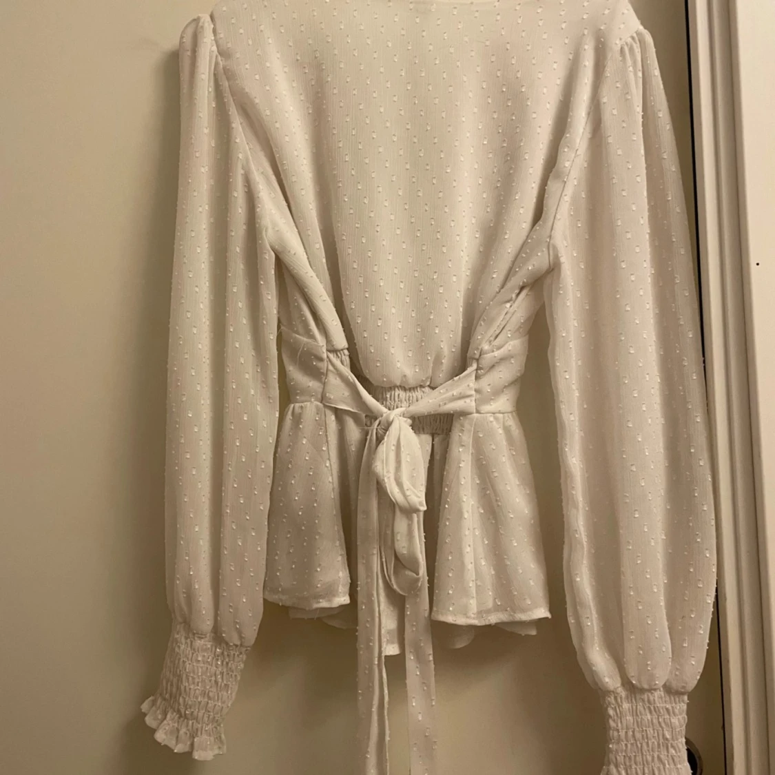 Säljer en söt vit blus från Amisu med v-ringning och knytband i ryggen. Blusen har långa ärmar med elastiska muddar och ett diskret prickigt mönster. Perfekt för en stilren look.