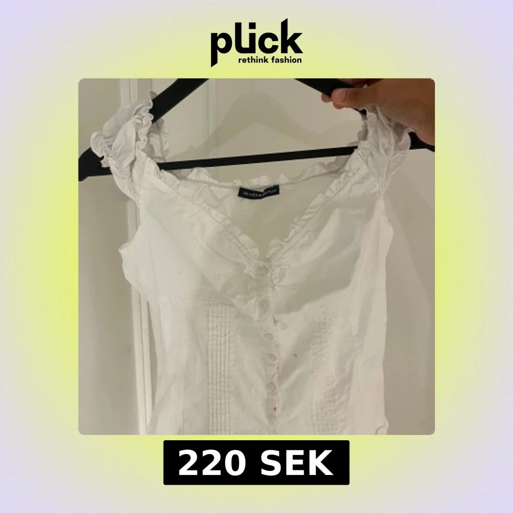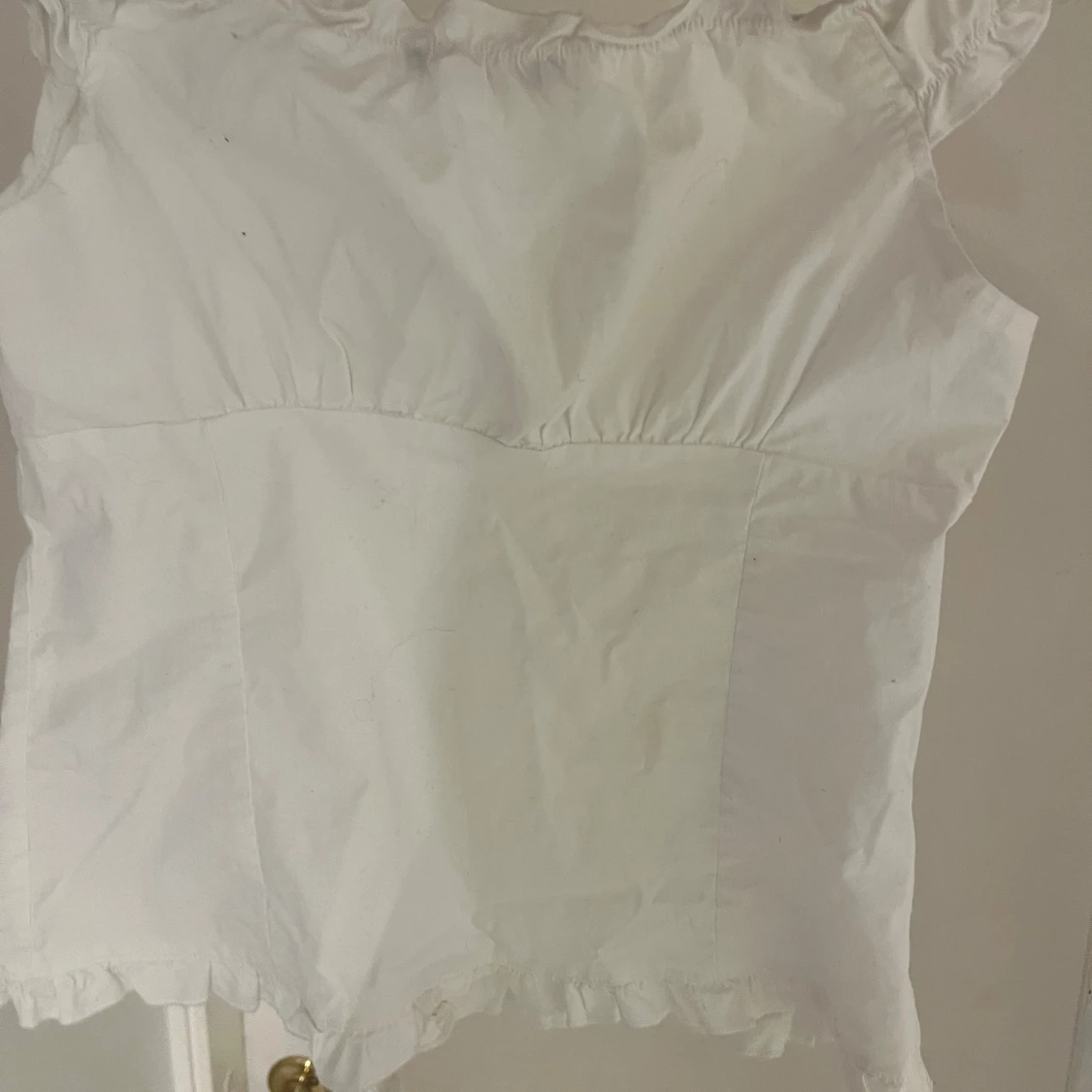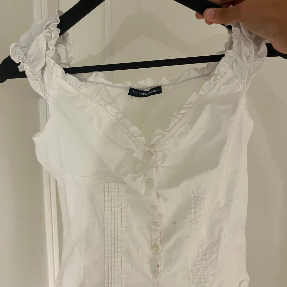 Supersöt vit blus från Brandy Melville med knappar framtill, rynkade axelband och volangdetaljer längs kanterna. Blusen har v-ringning och fina veckade detaljer framtill. Perfekt för en romantisk och feminin look. Har en liten fläck där fram men som knappt syns