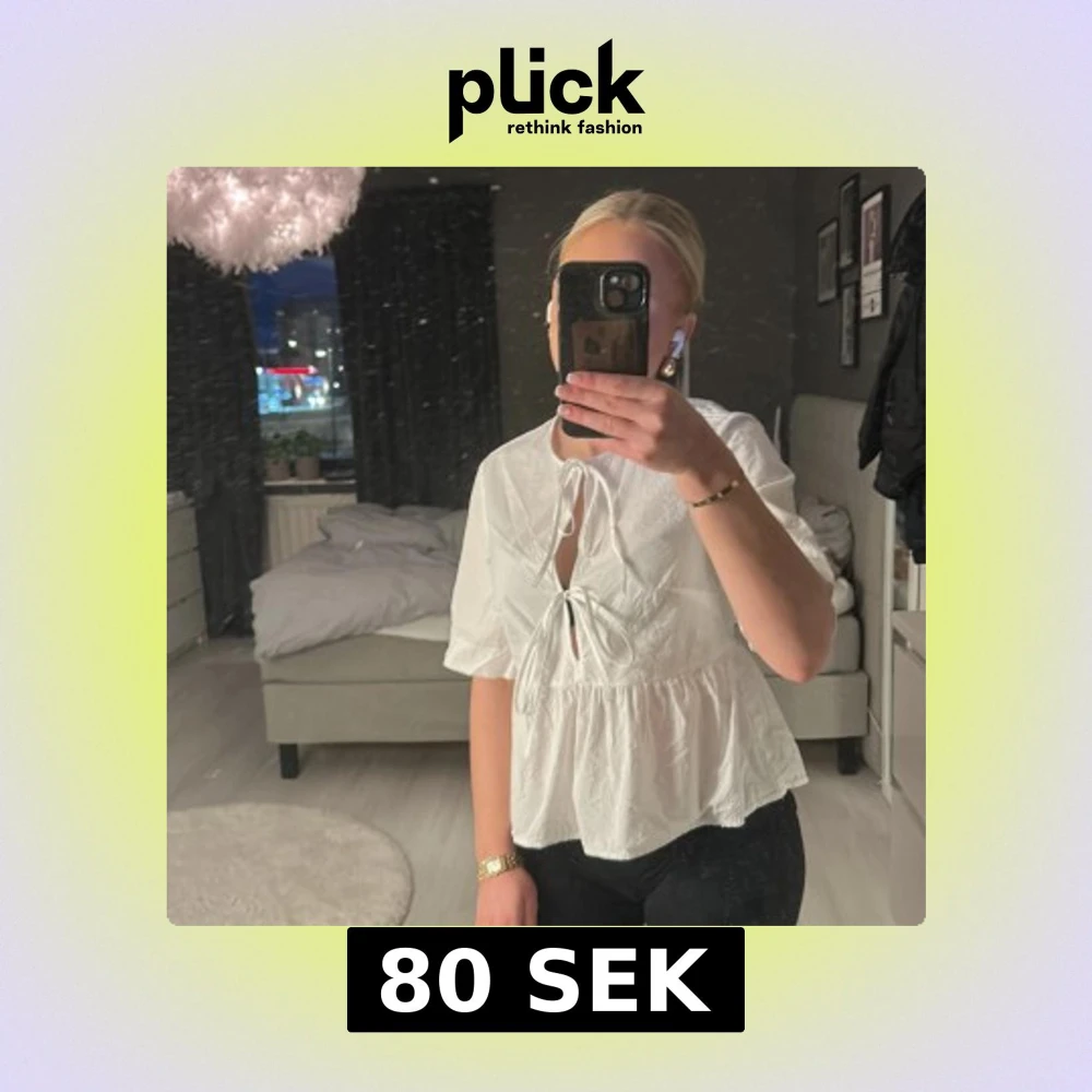Säljer en söt vit blus från Divided med knytning framtill och korta ärmar. Perfekt för en stilren look. Blusen har en luftig passform och är tillverkad i ett lätt material.
