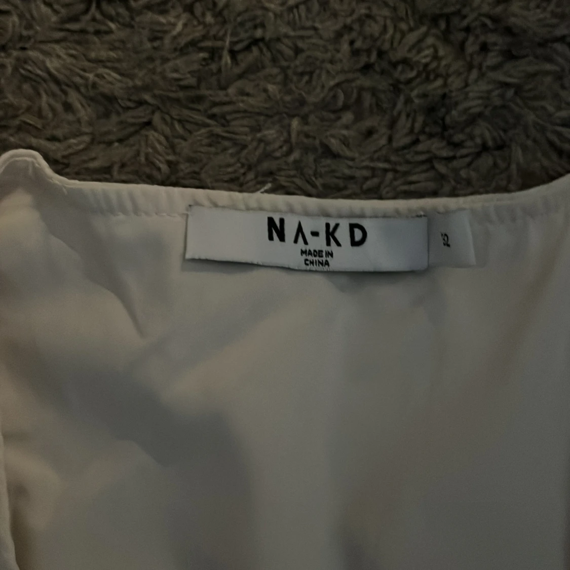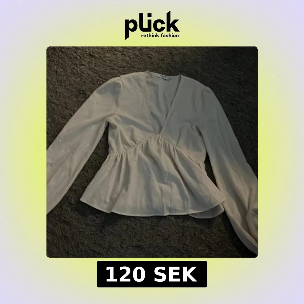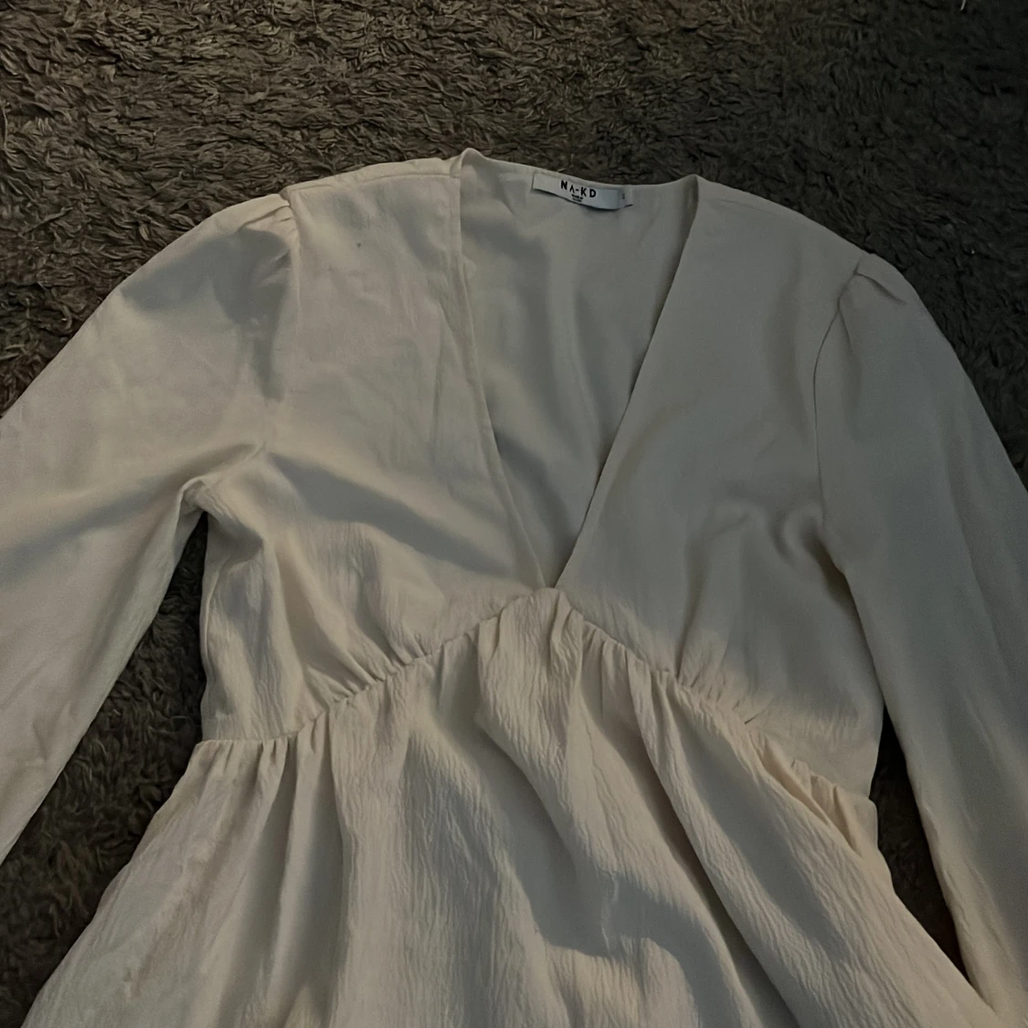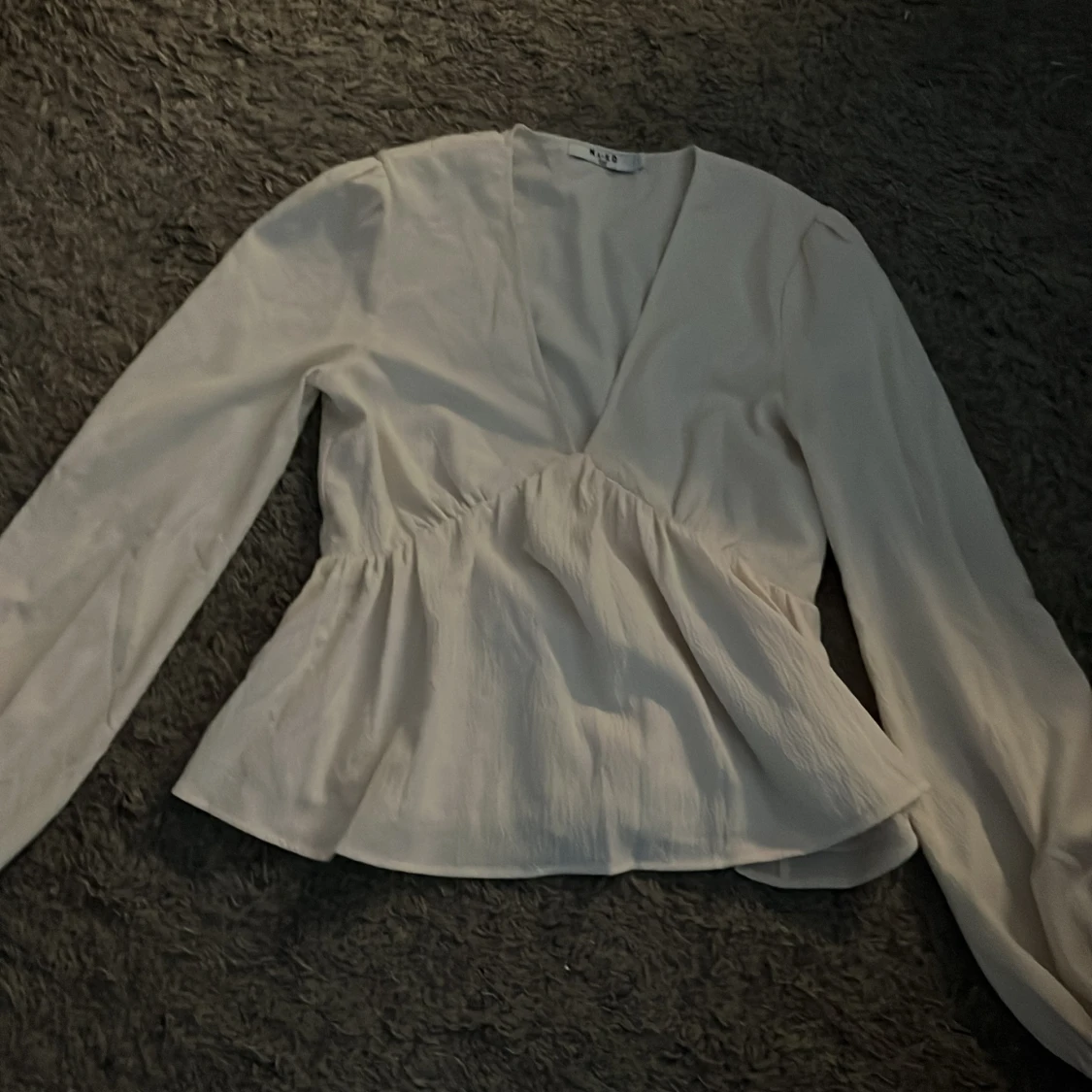 Säljer en stilren vit blus från NA-KD med v-ringning och långa ärmar. Blusen har en lätt rynkad midja som ger en fin passform. Perfekt för att skapa en elegant look.