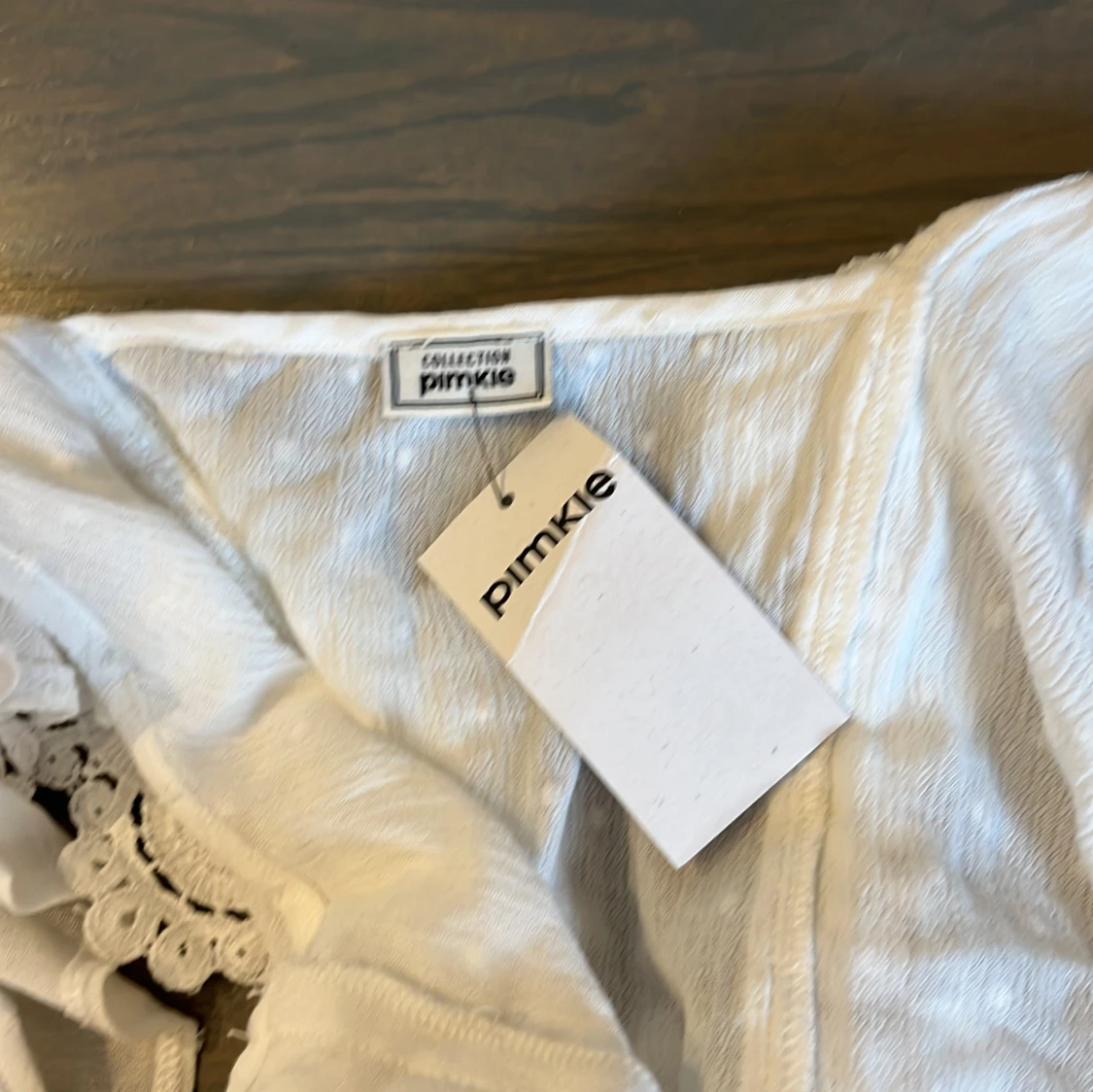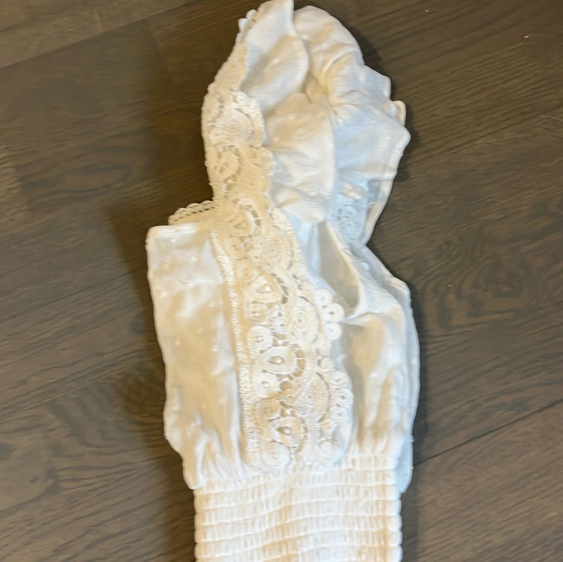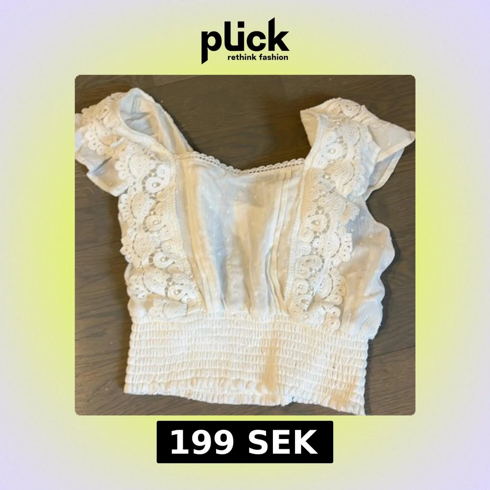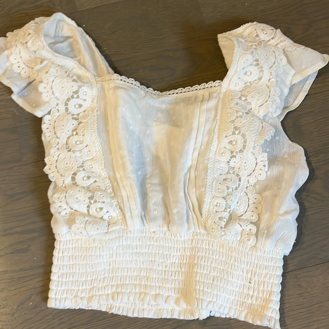 Charmig vit blus från Pimkie med spetsdetaljer och smockad nederkant. Blusen har korta ärmar och är perfekt för en somrig look!
