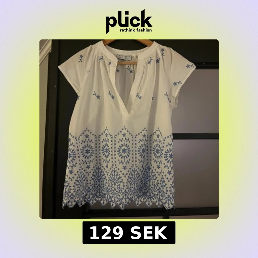 Superfin vit blus från Holly & Whyte med blått broderat mönster och v-ringning. Blusen har korta ärmar och dekorativa broderier både upptill och längs fållen. Perfekt för en fräsch och somrig look!