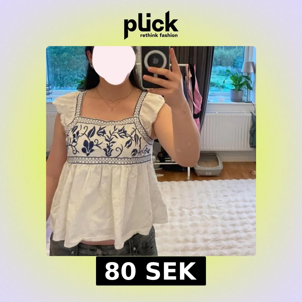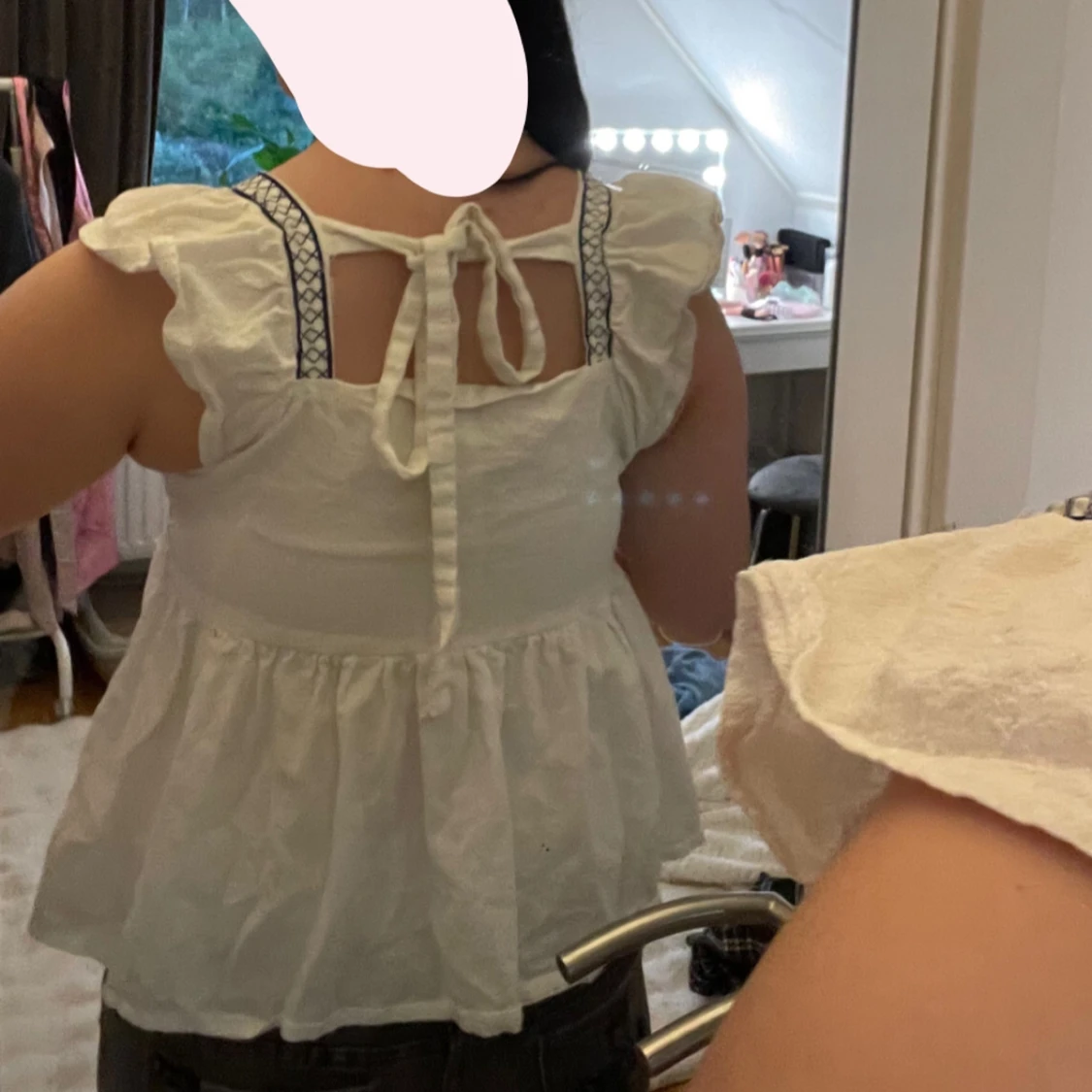 Supersöt vit blus med blått broderat blommönster framtill och volangärmar. Finns några fläckar invändigt men inget som syns, blid kan skickas vid intresse💗