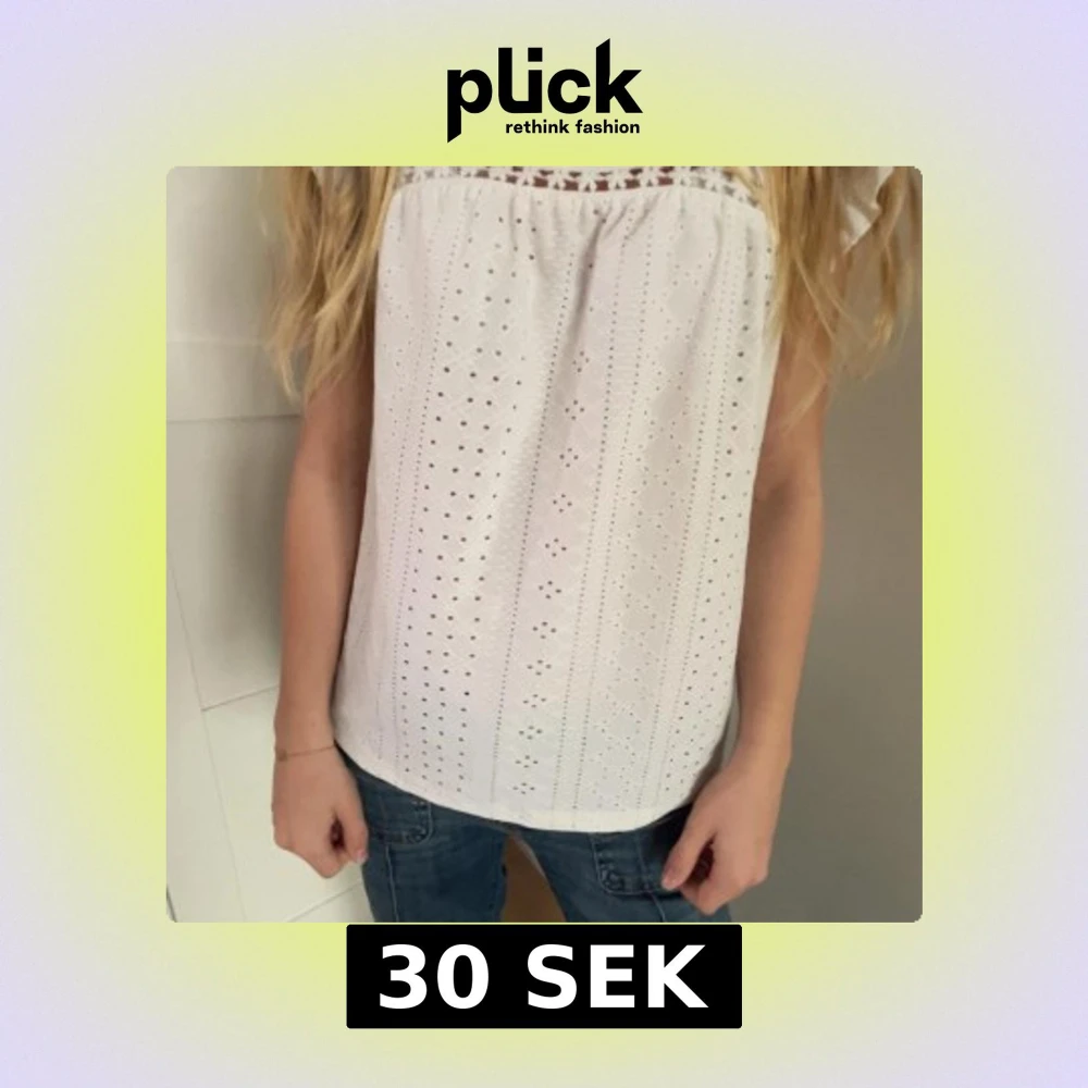 Säljer en söt vit blus med korta ärmar och broderade hålmönster. Blusen har en lös passform och är perfekt för varmare dagar. Den har fina spetsdetaljer upptill och är tillverkad i ett lätt bomullsmaterial.
