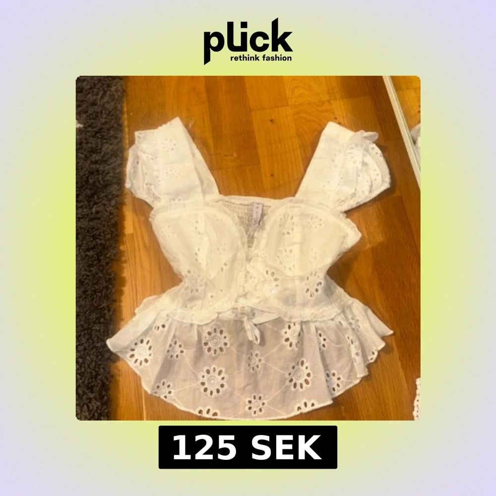 Superfin vit blus från Amisu med broderade blommor och volangkant. Toppen har puffiga korta ärmar, omlott framtill med knyt och en söt v-ringning. Materialet är lätt och luftigt bomull, perfekt för varma dagar.