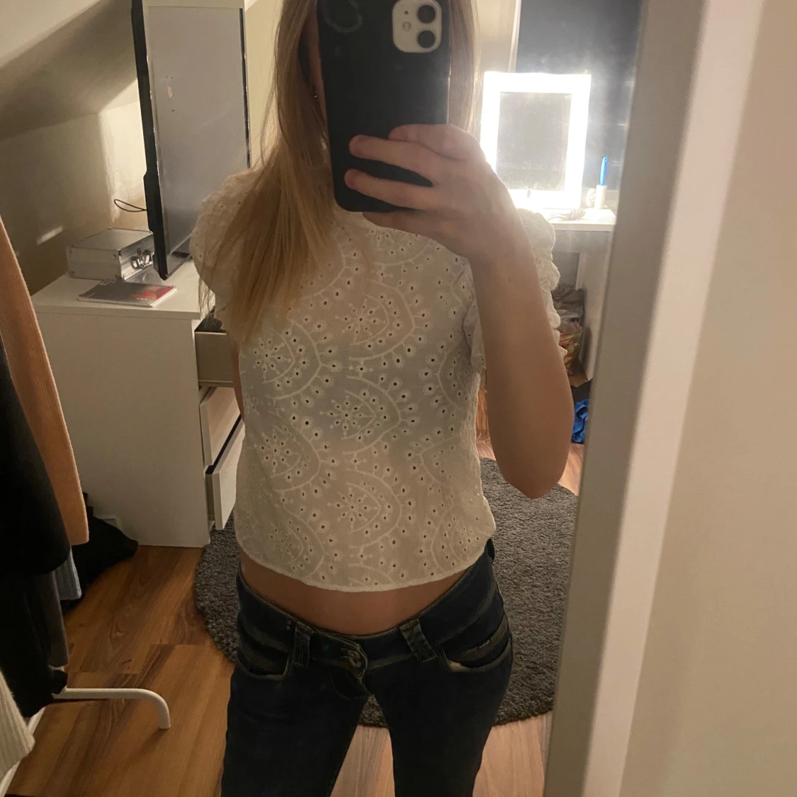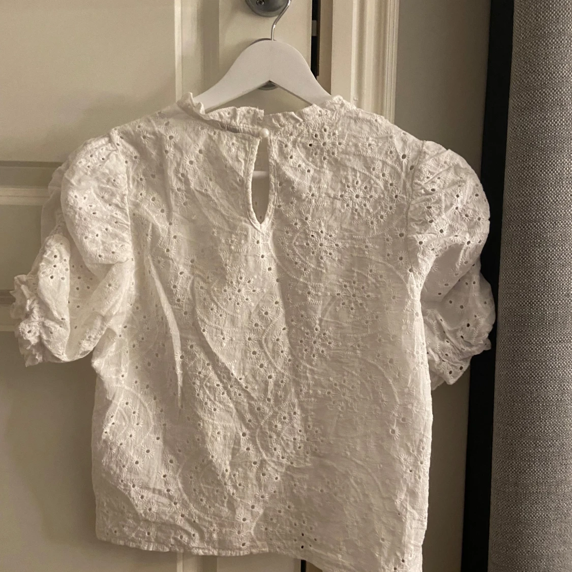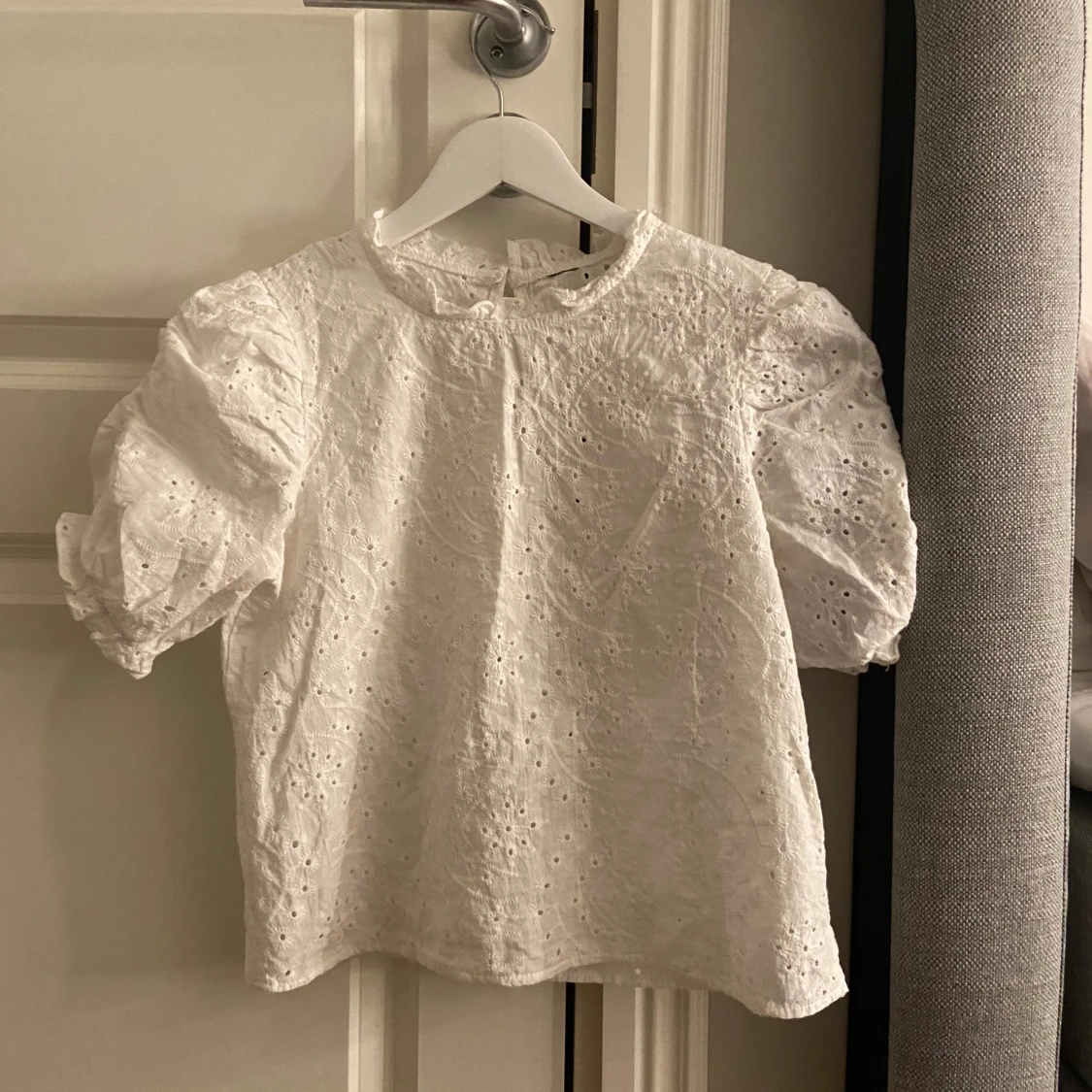 Säljer en superfin vit blus med broderade detaljer. Den har korta puffärmar och en söt knapp i nacken. Perfekt för vår och sommar! Passar både till jeans och kjol för en söt och stilren look.pris kan diskuteras 💕💕