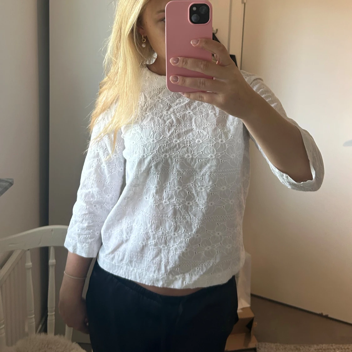 Säljer en söt vit blus med broderade blommönster och trekvartsärm. Blusen har en rak passform och är tillverkad i bomull, vilket gör den både luftig och bekväm. Köpt från sellpy men från GANT. Stl S