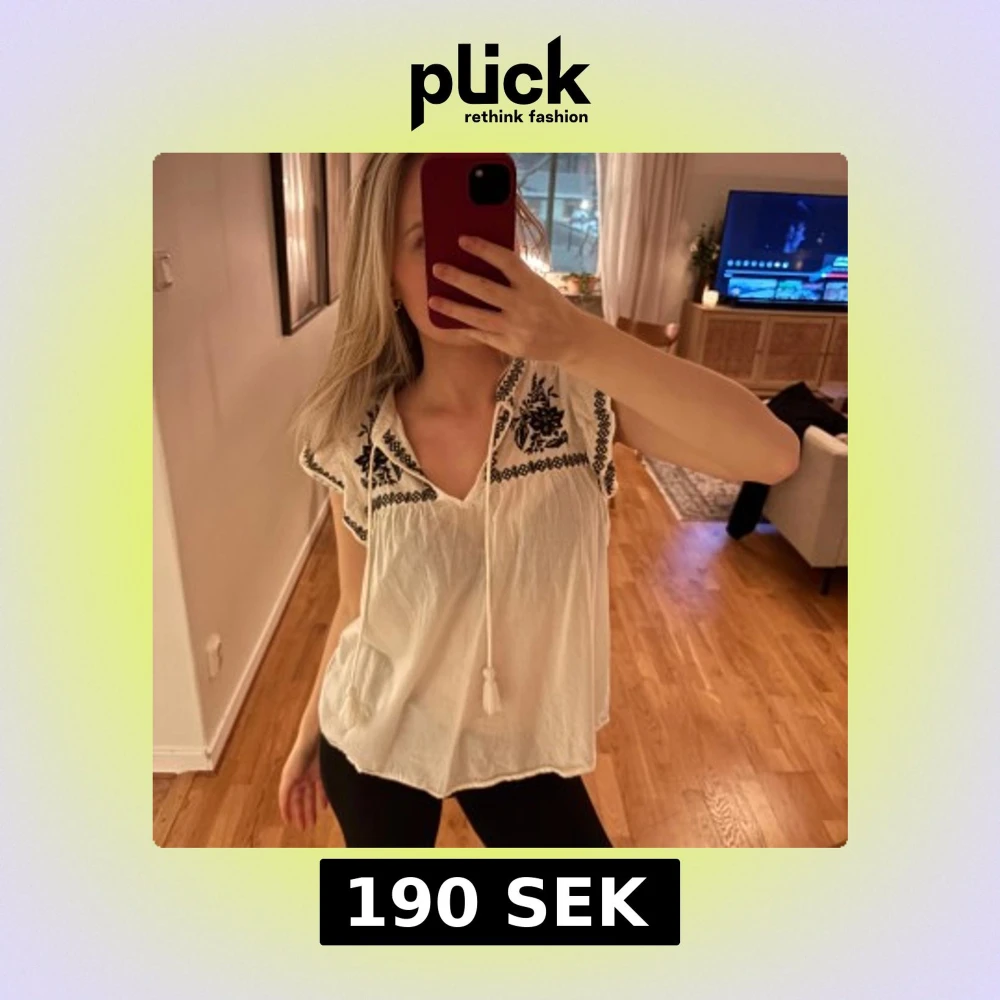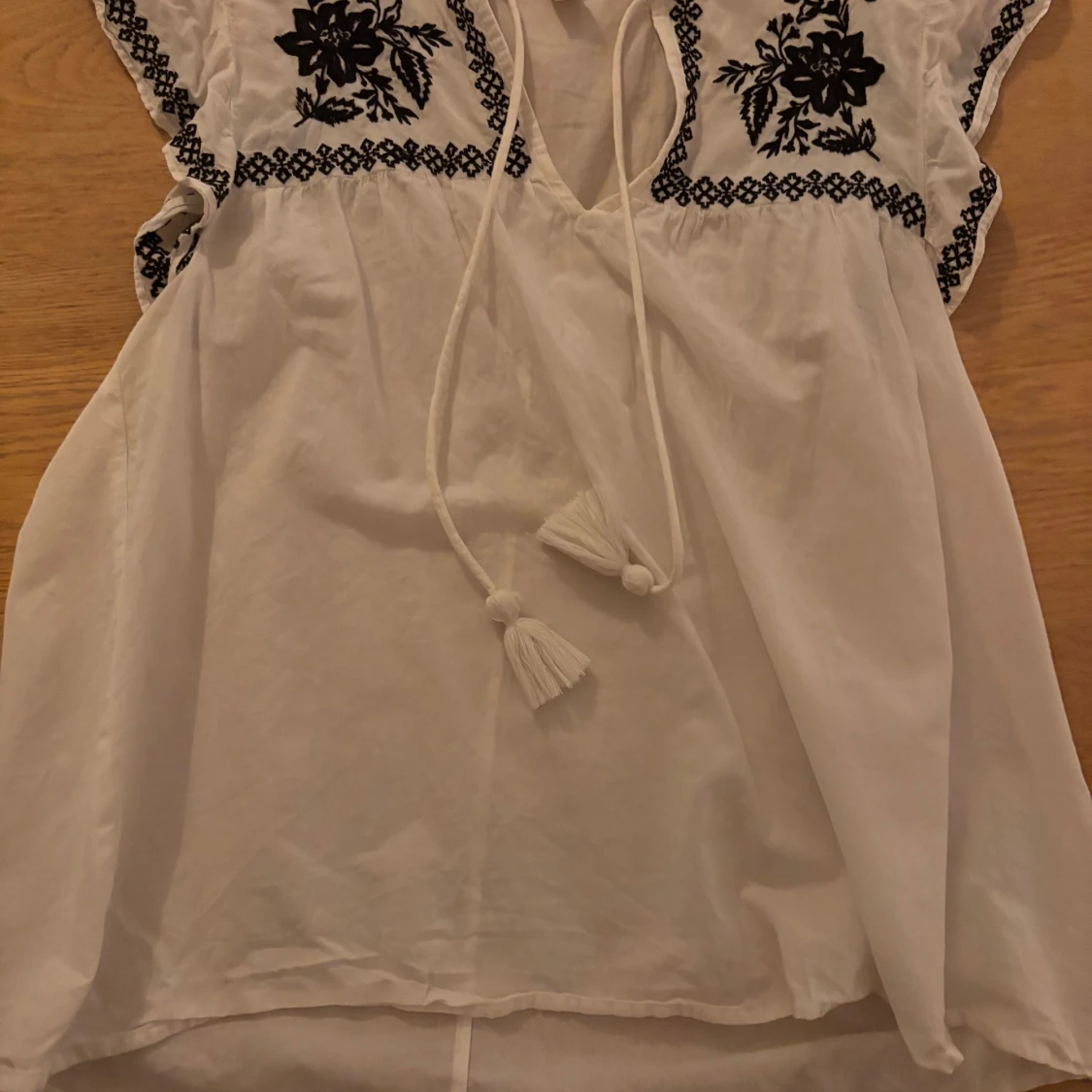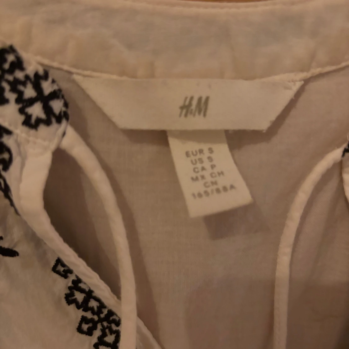 Säljer en vit blus från H&M med svart broderi och knytband framtill. Blusen har korta ärmar och en avslappnad passform, perfekt för en bohemisk look.