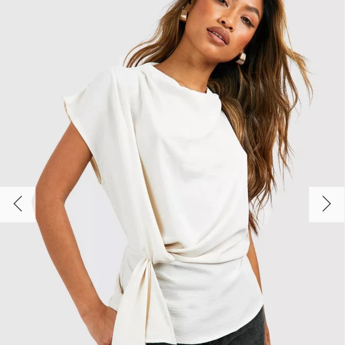 Elegant vit blus med korta ärmar och knyt i sidan. Perfekt för en stilren look. Blusen har en lös passform och är tillverkad i ett mjukt material som ger en skön känsla.