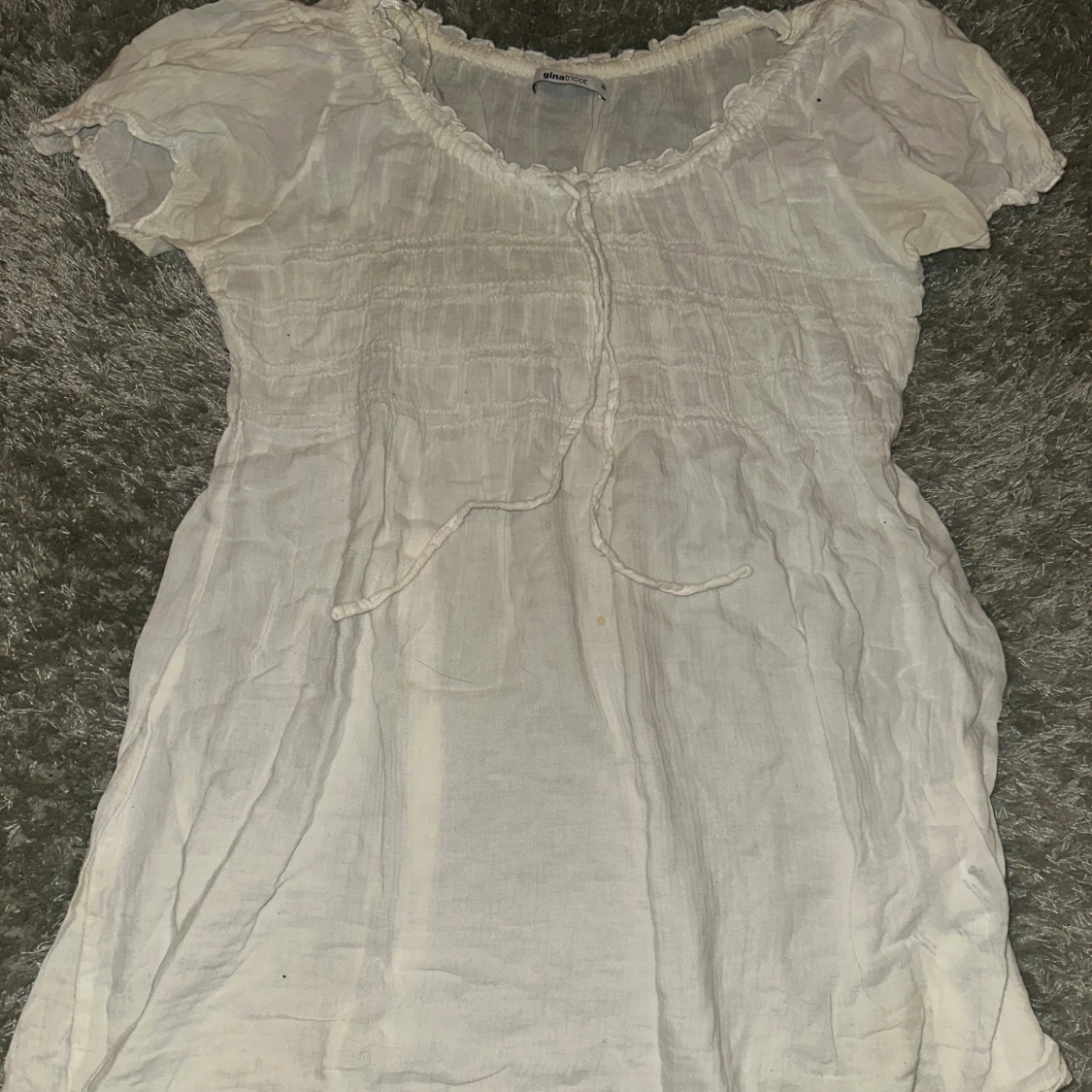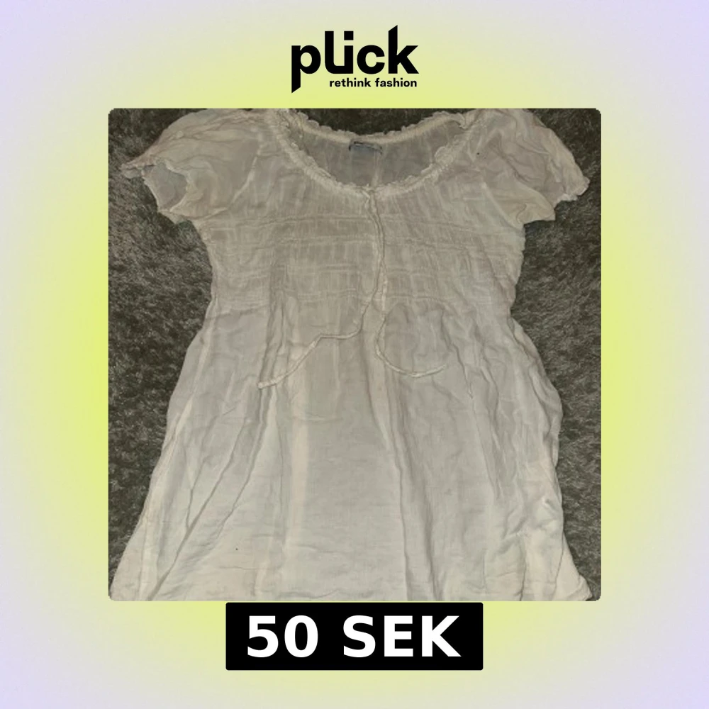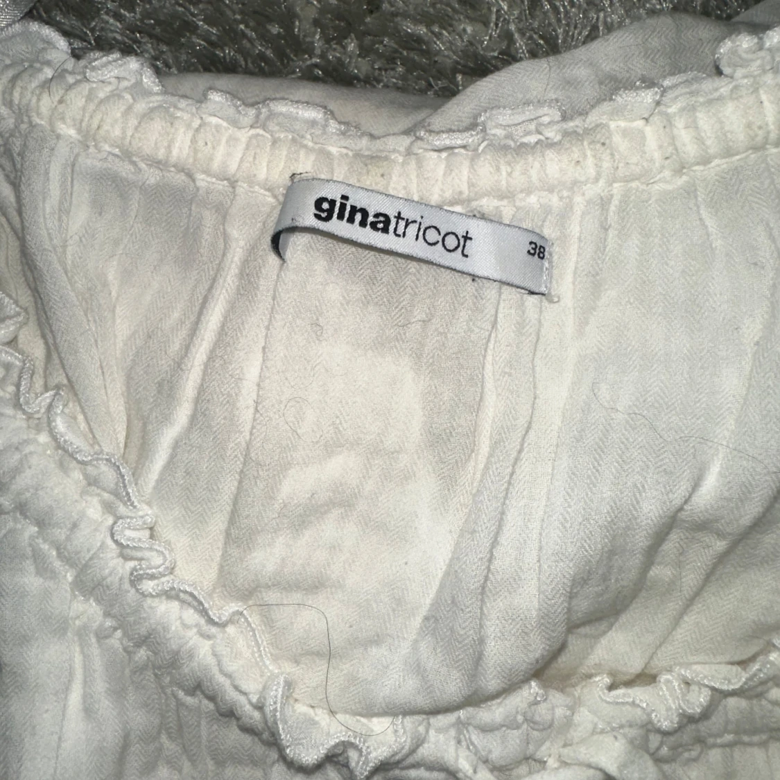 Söt vit blus från Gina Tricot i storlek 38. Blusen har korta ärmar, rynkade detaljer och knyt framtill vid halsen. Den är tillverkad i ett lätt och luftigt tyg, perfekt för varmare dagar. Rundad halsringning med volangkant ger en romantisk känsla.