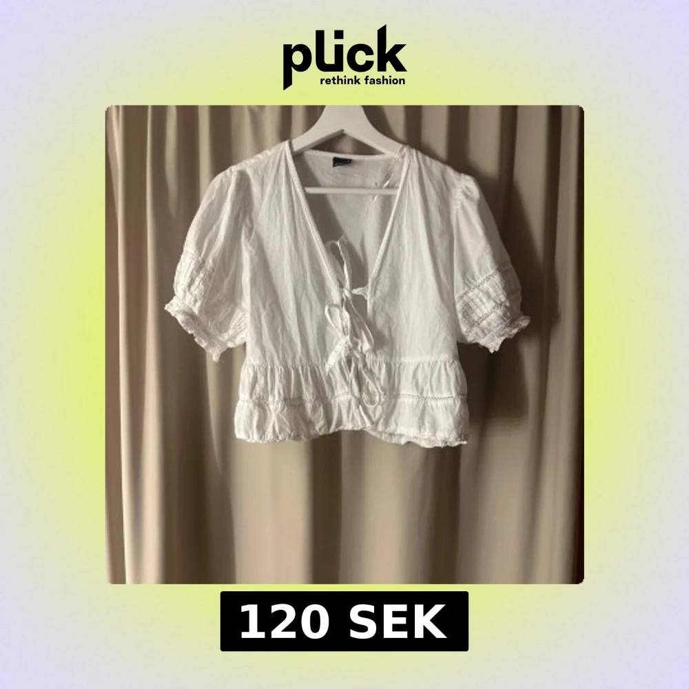 Söt vit blus med korta puffärmar, v-ringning och knyt framtill. Blusen har volangdetaljer längs nederkanten och ärmarna samt fina broderade inslag.💓