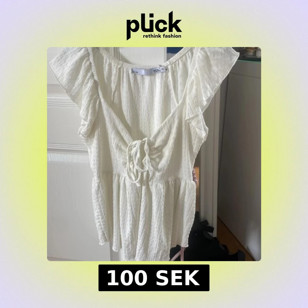 Supersöt vit blus i crinklat tyg med v-ringning, knyt framtill och volangdetaljer vid axlarna. Lätt och luftig modell som passar perfekt till sommaren. Kortärmad och med avslappnad passform.