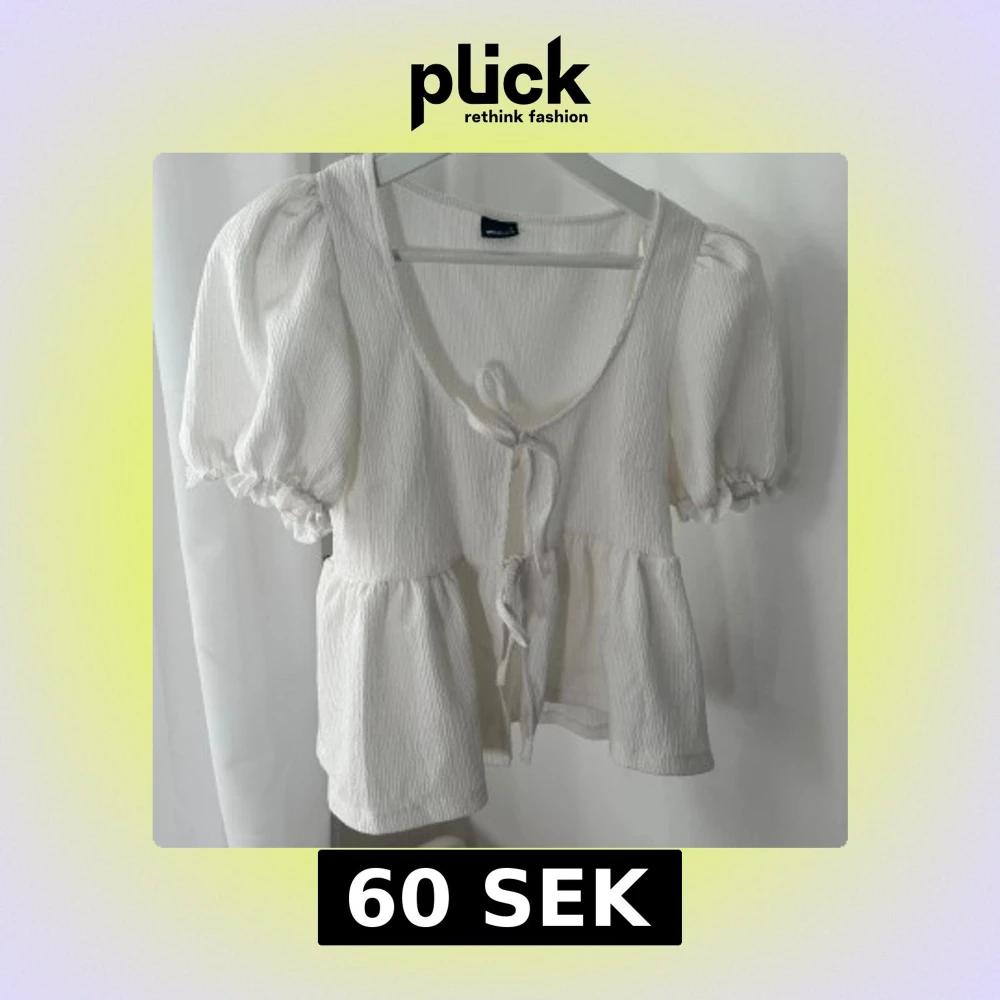 Charmig vit blus med korta puffĂ€rmar och knytning framtill. Blusen har en u-ringad designđ