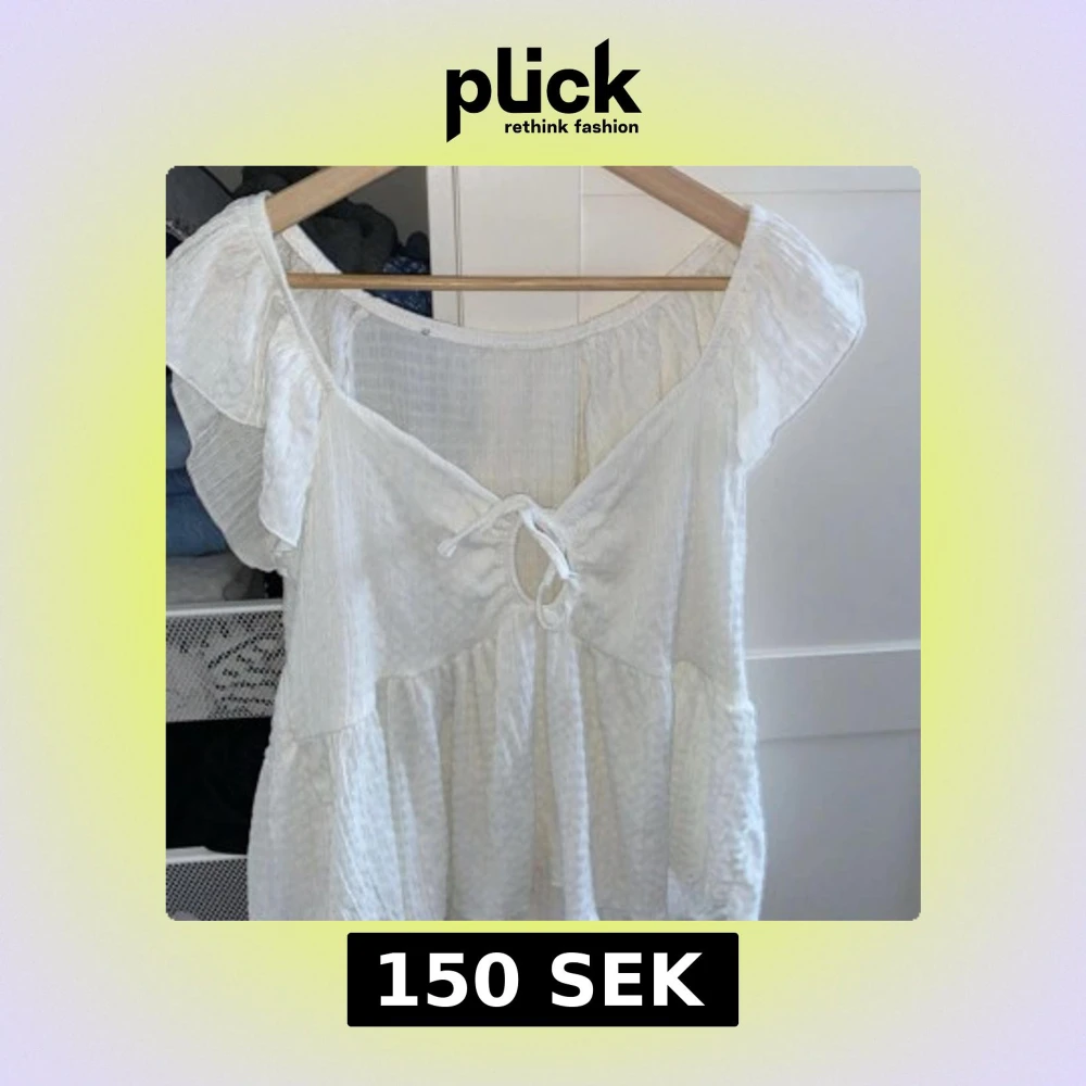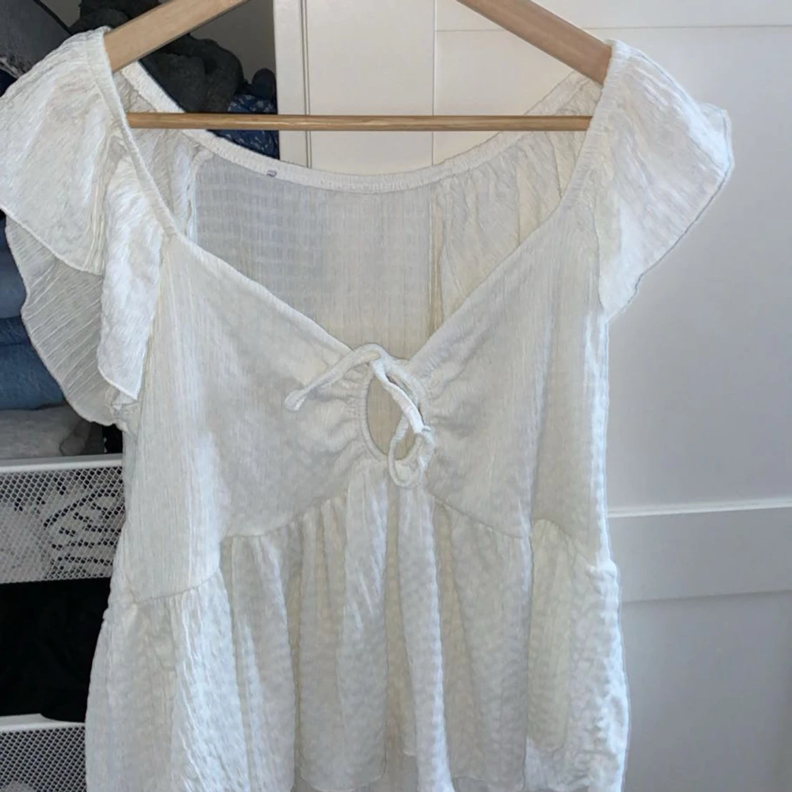 Charmig vit blus med korta ärmar och knytning framtill. Blusen har en luftig och lätt design med volangdetaljer vid ärmarna, perfekt för varma dagar.