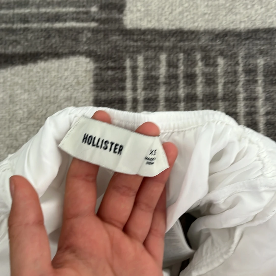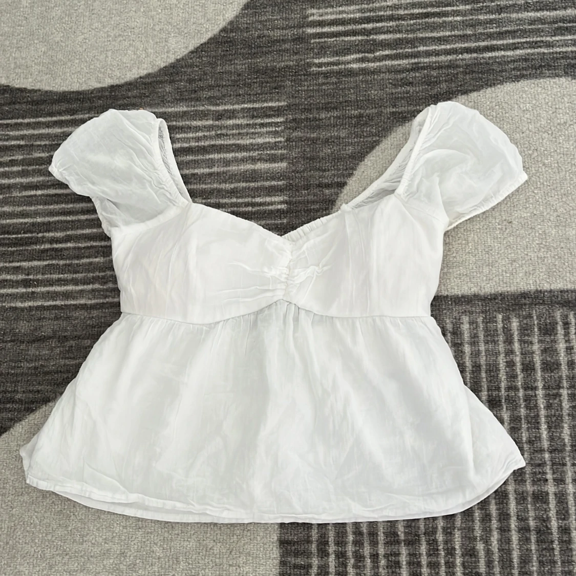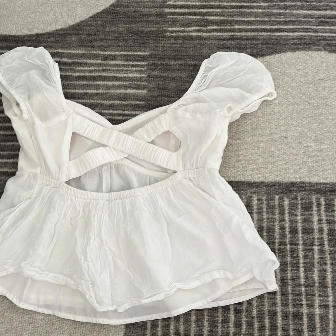 Supersöt vit blus från Hollister med puffiga korta ärmar och v-ringning. Toppen har en flowy passform och snygga korsade band samt öppen rygg. Perfekt för sommarens alla tillfällen och ger en romantisk vibe. Tillverkad i ett lätt och luftigt material.