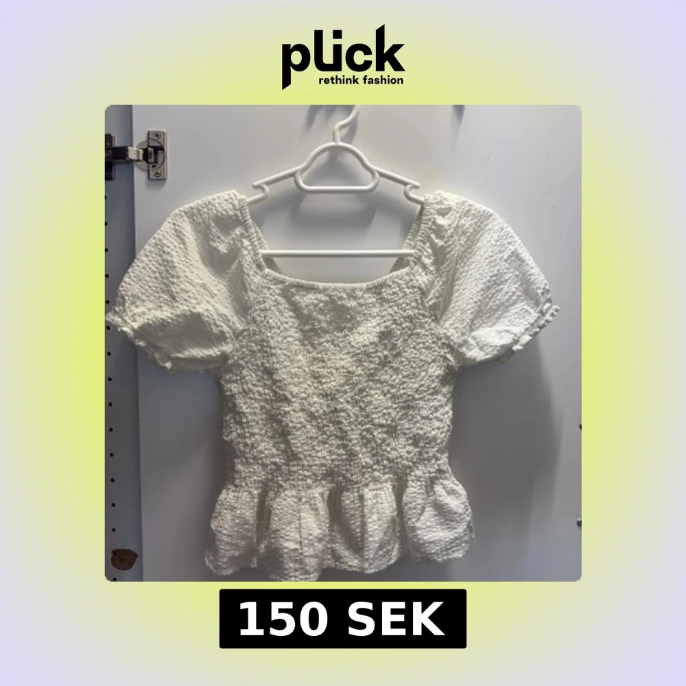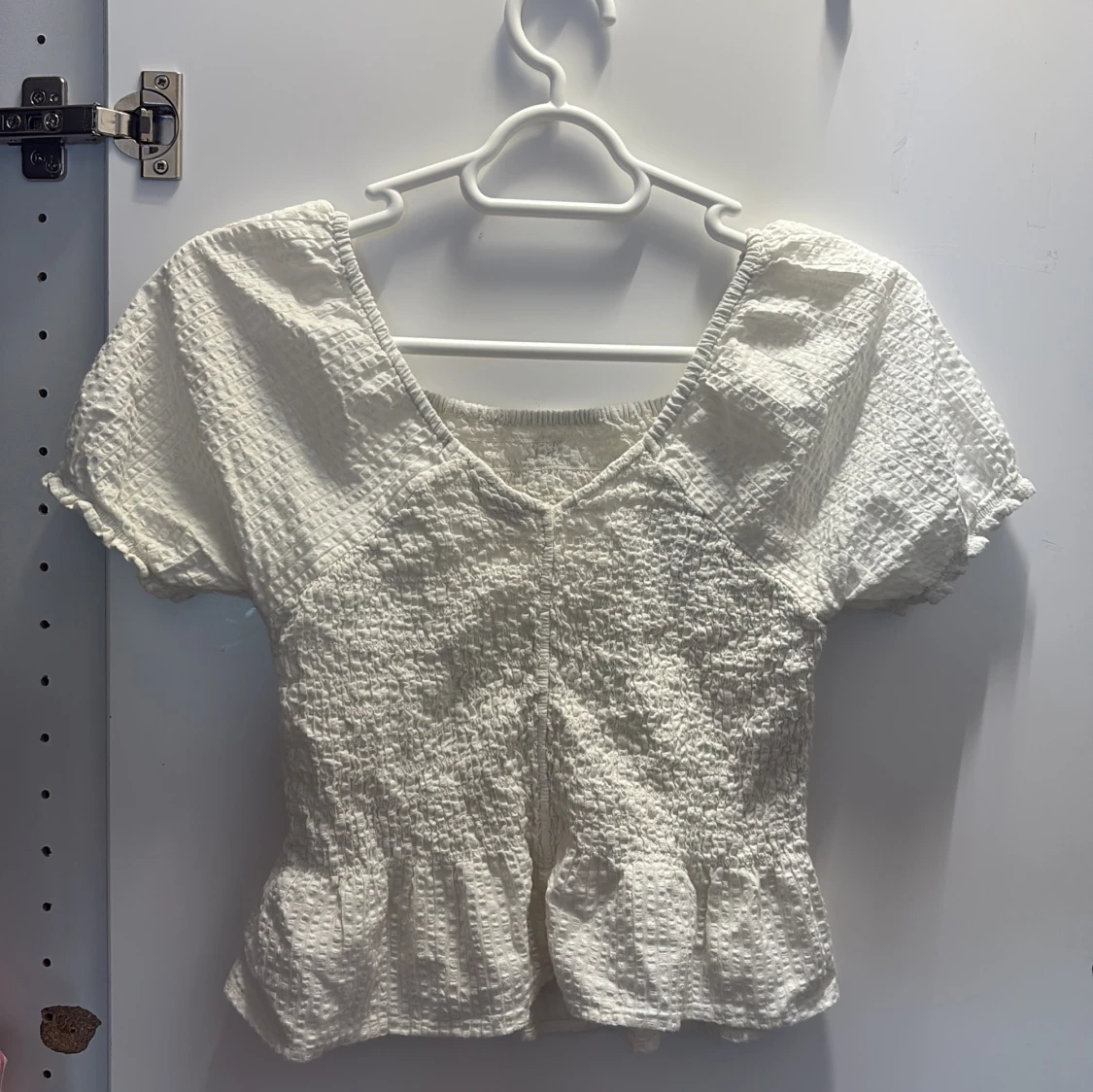 Supersöt vit blus med puffiga korta ärmar och smockad struktur. Toppen har fyrkantig ringning fram och v-ringning bak samt volangkant nertill. Perfekt för dig som gillar romantisk och trendig stil.