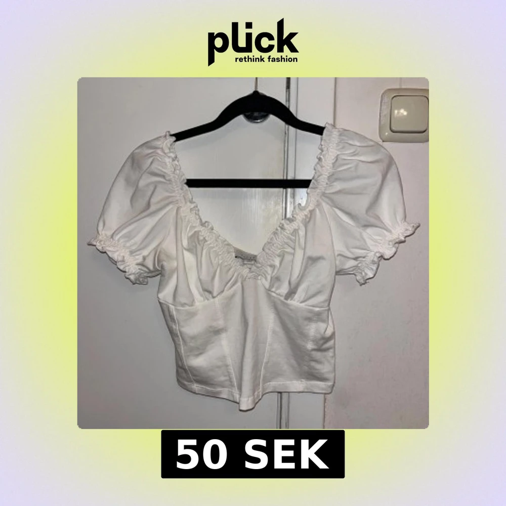 Söt vit blus med puffiga kortärmar och rynkade detaljer vid halsringningen, croppad passform, mjukt och bekvämt material. Endast testad, säljer pga inte rätt passform. Strl 34