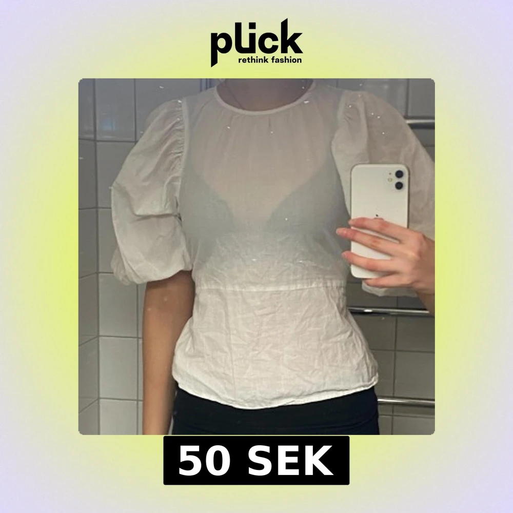 Säljer en stilren vit blus med puffiga kortärmar och en öppen rygg. Blusen har knytband i ryggen för en justerbar passform. Perfekt för en chic och luftig look.