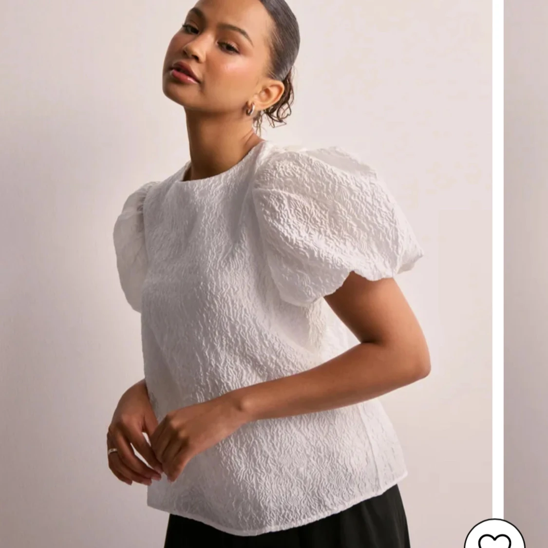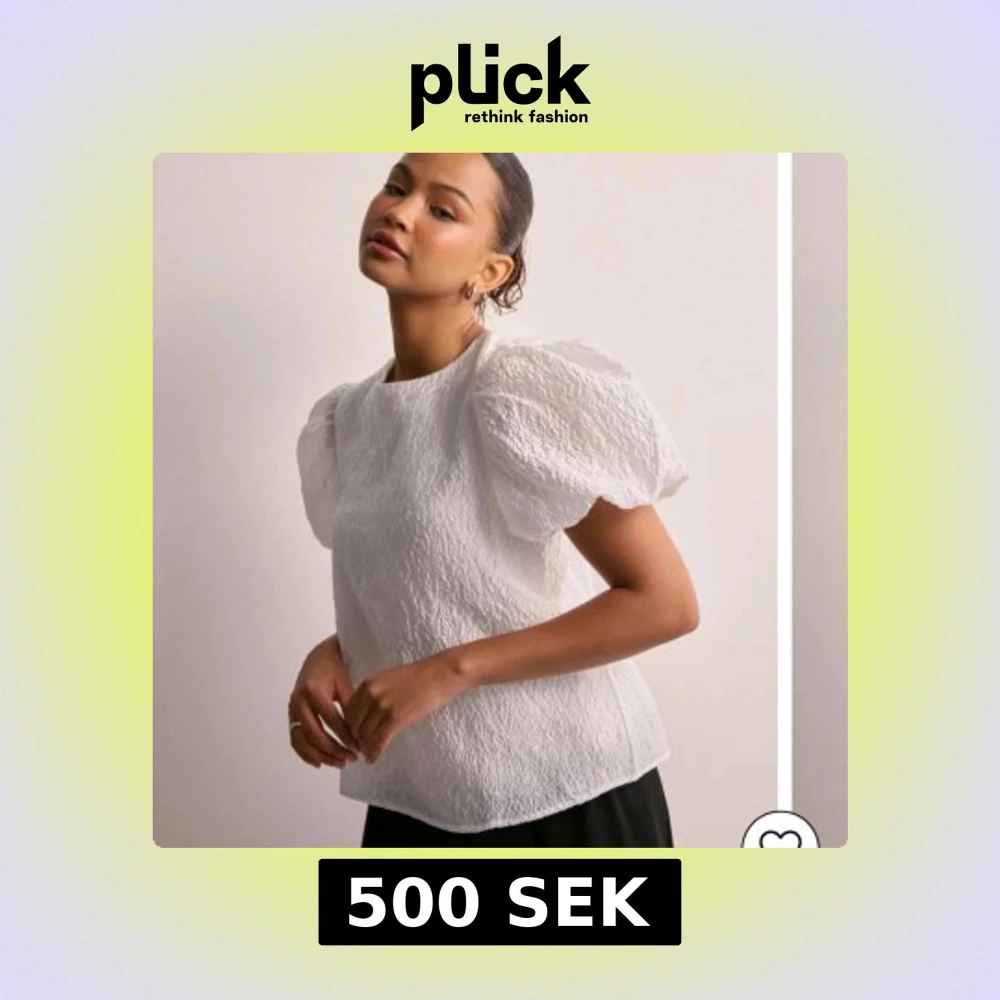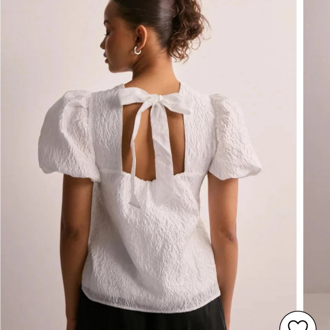 Supersöt vit blus med puffiga korta ärmar och strukturerat tyg. Baksidan har en öppen detalj med knytband i nacken som ger en extra touch. Perfekt för dig som gillar romantiska och trendiga plagg med volym. Nypris: 600 därav säljs för 500 då använd en gång och i nyskick, pris går att diskutera lite