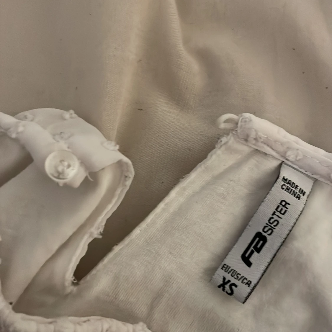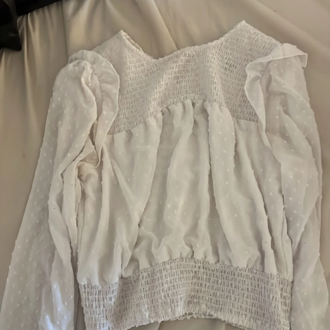 Säljer en söt vit blus från FB Sister i storlek XS. Blusen har smock upptill och nedtill, volangdetaljer vid axlarna och långärmade ärmar med diskret prickigt mönster. Materialet är lätt och luftigt, perfekt för vår och sommar. Knappar finns vid halsen för extra detalj.