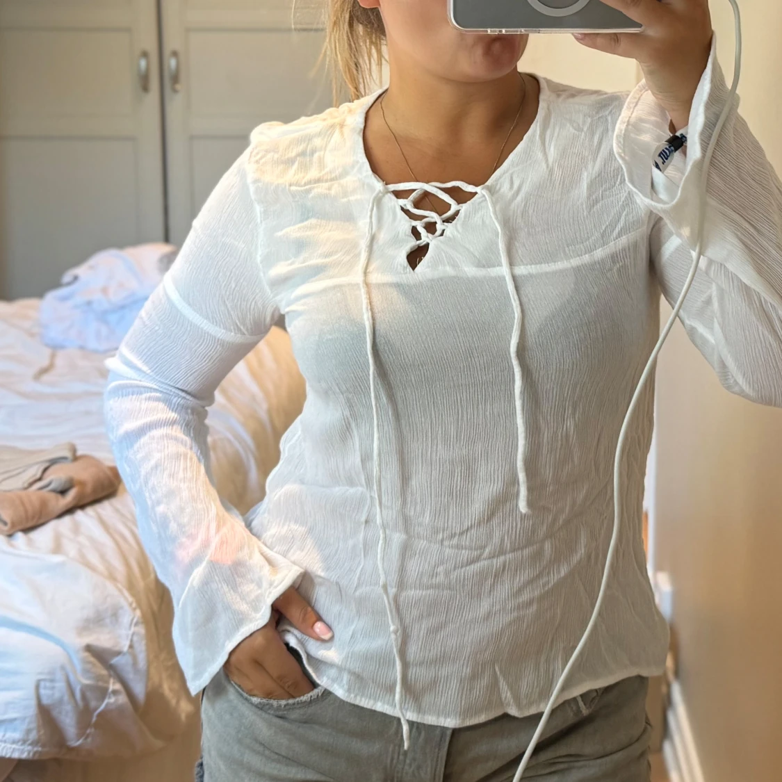 Supersöt vit blus från Angelology lager 157 i tunn, lätt krinklad bomull. Långärmad modell med v-ringning och snygg snörning framtill. Perfekt för dig som gillar en chill och luftig stil. Ärmarna har lite utsvängd känsla för extra vibe.