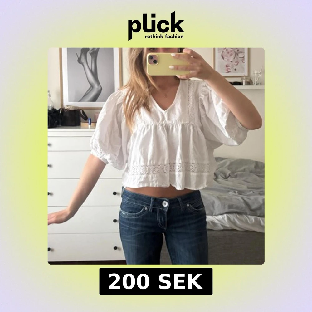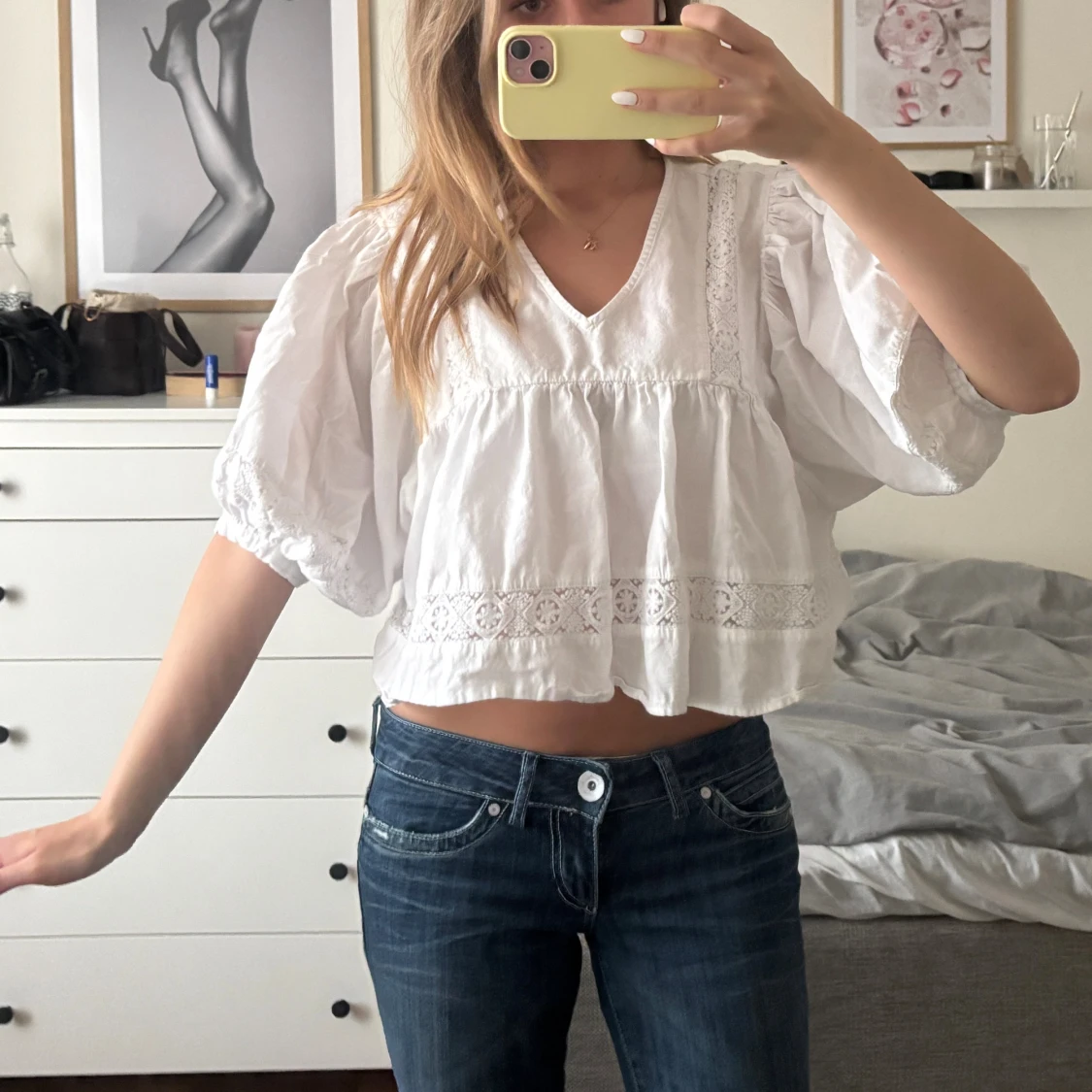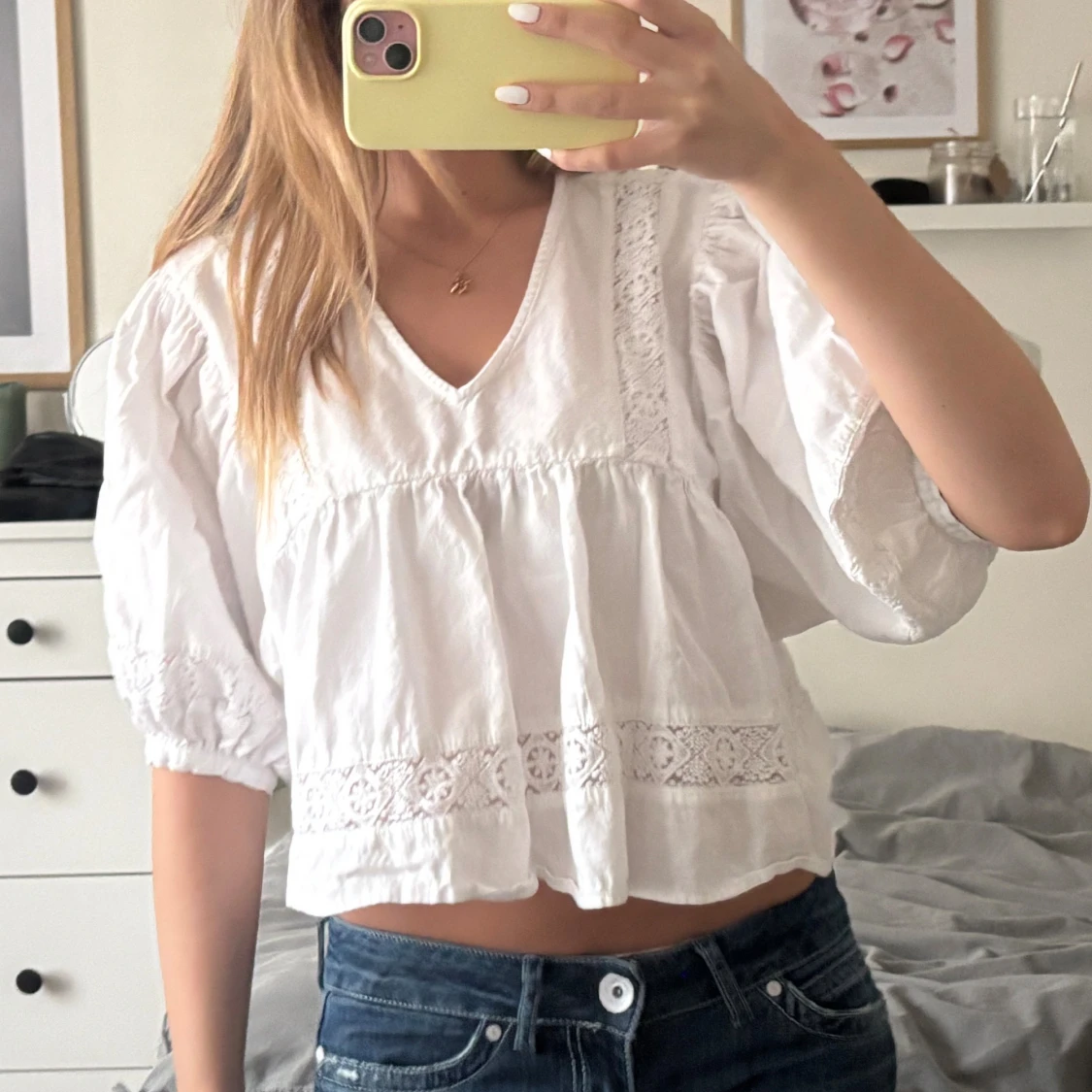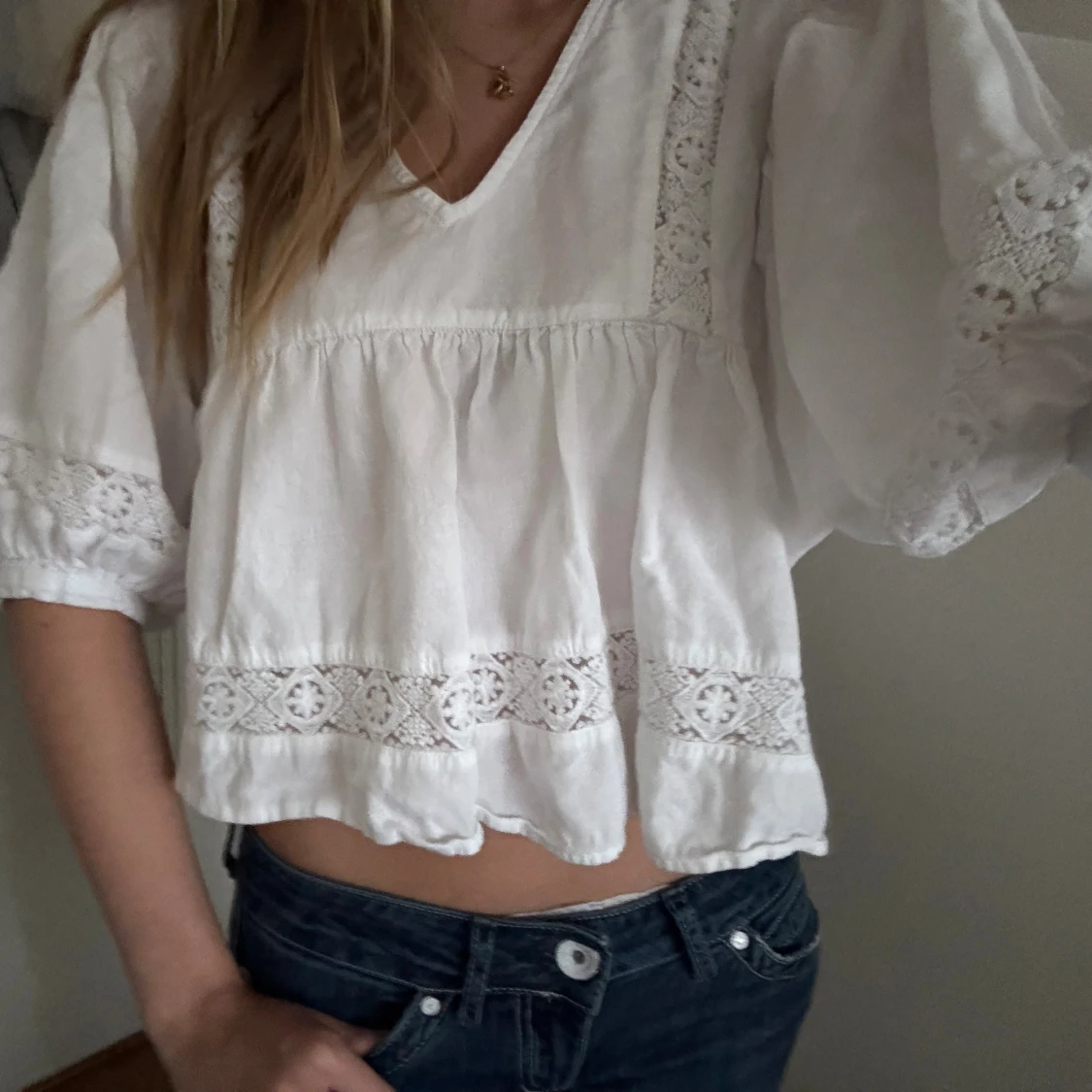 Supersöt vit blus från Pigalle med v-ringning, vida trekvartsärmar och fina spetsdetaljer både framtill och på ärmarna. Blusen är croppad och har en luftig passform, perfekt till jeans eller kjol för en fräsch look.