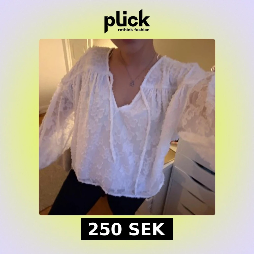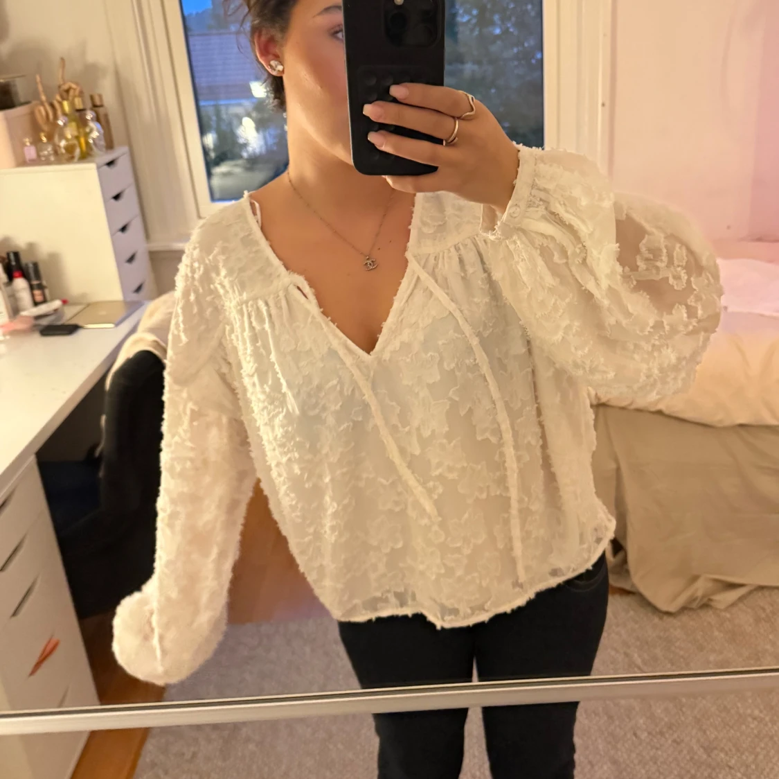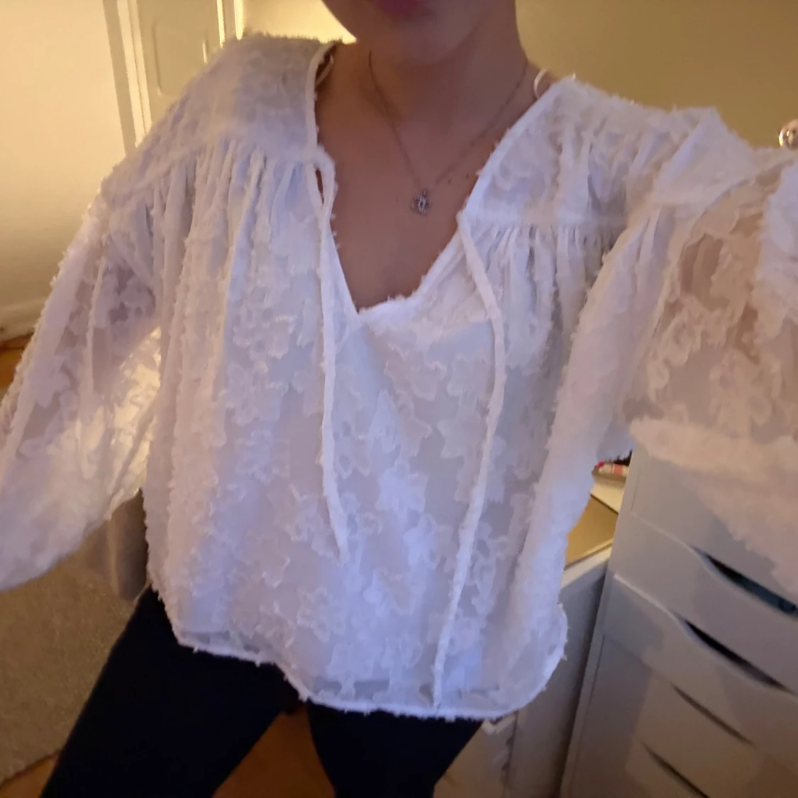 Säljer en superfin vit blus med v-ringning och knytband framtill. Blusen har långa, luftiga ärmar och är täckt av ett vackert spetsmönster som ger en romantisk vibe. Perfekt att styla med jeans eller kjol för en trendig look.
